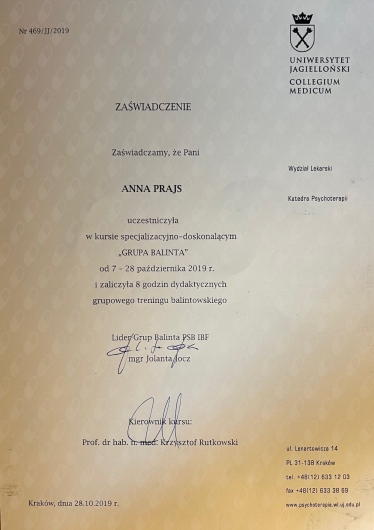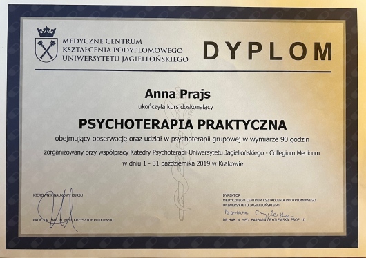 Doświadczenie nabywałam podczas praktyk w Krakowskim Instytucie Psychoterapii, kursu/stażu „Psychoterapia praktyczna” organizowanego przez Katedrę Psychoterapii CM UJ, obecnie prowadzę prywatną praktykę w gabinecie.
