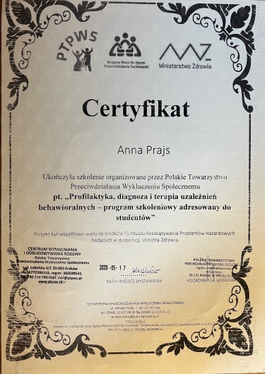 Jestem członkiem Polskiego Towarzystwa Psychiatrycznego oraz Sekcji Naukowej Psychoterapii.