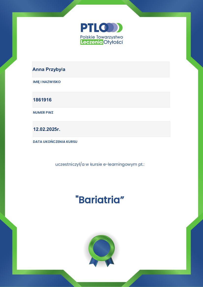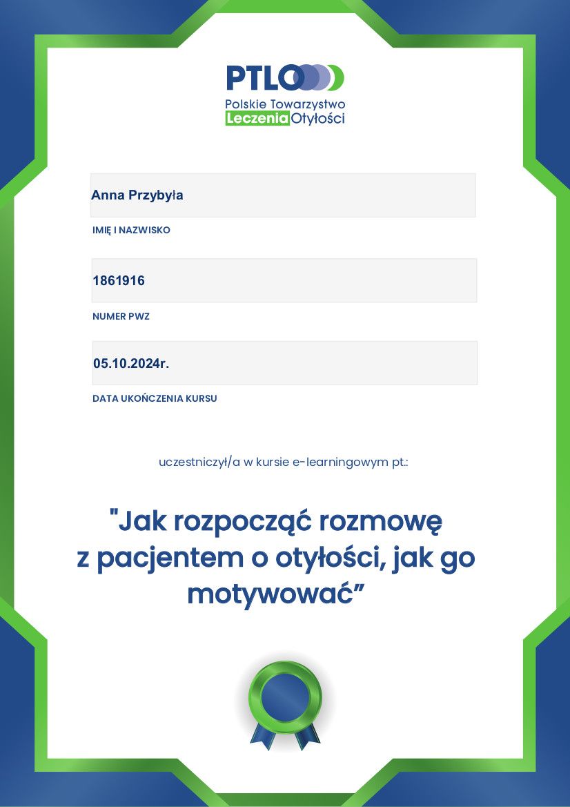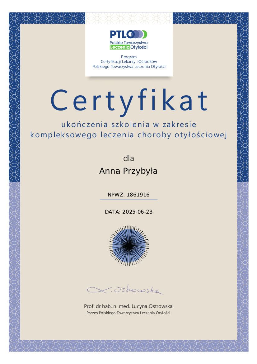 Jestem członkiem Towarzystwa Internistów Polskich i członkiem Polskiego Towarzystwa Leczenia Otyłości. Nieustannie pogłębiam swoją wiedzę uczestnicząc w licznych zjazdach i sympozjach naukowych.