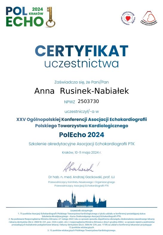 Jaki jest zakres porad oferowanych przez Anna Rusinek-Nabiałek?Anna Rusinek-Nabiałek to kardiolog. Na podstawie swojego doświadczenia i wykształcenia Anna Rusinek-Nabiałek oferuje usługi takie jak: konsultacja kardiologiczna, ECHO serca dorośli, Konsultacja kardiologiczna + EKG (pierwszorazowa), konsultacja kardiologiczna + ECHO serca + EKG (pierwsza wizyta), Test wysiłkowy na bieżni, 24 godzinne EKG met. Holtera, 48-godzinna rejestracja EKG met. Holtera, 24-godzinna rejestracja ciśnienia met. Holtera.