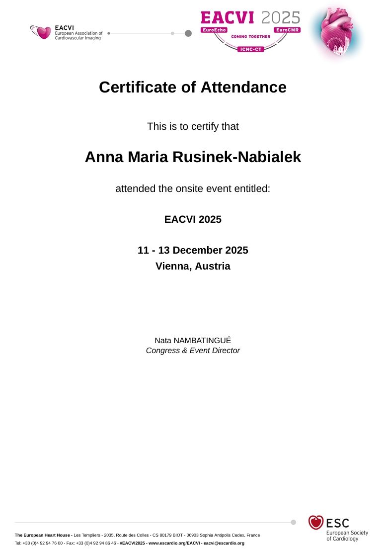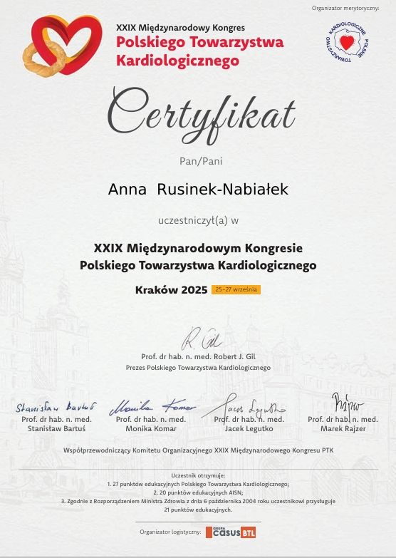 Swoje doświadczenie z kardiologii zdobywałam w Oddziale Kardiologii Szpitala Miejskiego Specjalistycznego im. Gabriela Narutowicza w Krakowie gdzie w 2015 roku rozpoczęłam specjalizację a od 2019 roku zostałam zatrudniona na stanowisku Starszego Asystenta i prowadziłam salę wzmożonego nadzoru kardiologicznego. Dodatkowo uczęszczałam na liczne staże i kursy specjalizacyjne oraz doskanalające w Szpitalach Wielospecjalistycznych zarówno w Krakowie jak i w Warszawie. Ponadto dzięki dyżurom w Oddziale Klinicznym Kardiologii Inwazyjnej, Elektroterapii i Angiologii Szpitala św. Rafała w Krakowie mogę podnosić swoje kwalifikacje.