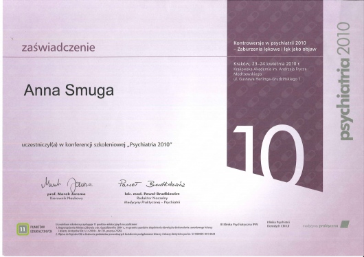 Jaki jest zakres porad oferowanych przez Anna Smuga - Szrajber?Anna Smuga - Szrajber to psychiatra. Na podstawie swojego doświadczenia i wykształcenia Anna Smuga - Szrajber oferuje usługi takie jak: konsultacja online (pierwsza), konsultacja online (kolejna), Konsultacja Lekarze dla Ukrainy / Консультація Лікарі для України.