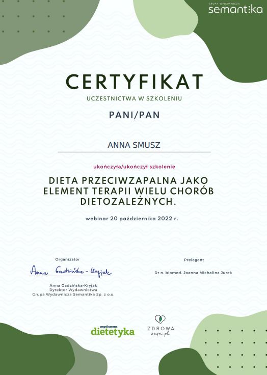 Jestem bardzo zadowolony ze współpracy z panią Anną Smusz. To profesjonalistka z ogromną wiedzą i indywidualnym podejściem do pacjenta. Już na pierwszej wizycie dokładnie przeanalizowała moje potrzeby, wyniki badań i styl życia, dzięki czemu plan żywieniowy był idealnie dopasowany do mnie. Dieta okazała się smaczna, prosta w przygotowaniu i przede wszystkim skuteczna — w krótkim czasie zauważyłem realne efekty. Bardzo doceniam też stały kontakt i wsparcie motywacyjne, które pomogło mi wytrwać w zmianie nawyków. Serdecznie polecam współpracę każdemu, kto szuka kompetentnego i empatycznego dietetyka!
