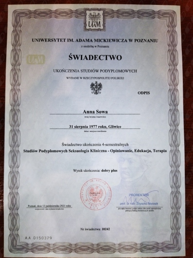 Jestem również absolwentką Studiów Podyplomowych z zakresu Seksuologii na UAM w Poznaniu.