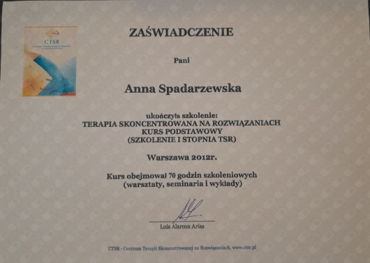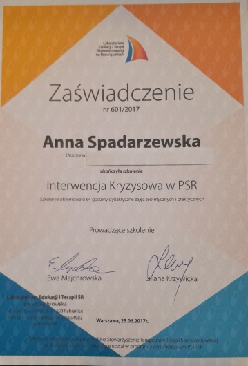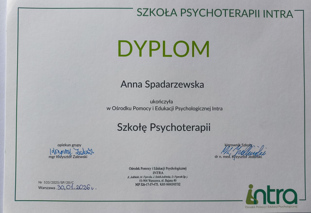 Jestem psychologiem i psychoterapeutką. Ukończyłam psychologię kliniczną w Szkole Wyższej Psychologii Społecznej w Warszawie. Ukończyłam 4-letnie szkolenie psychoterapeutyczne w Szkole Psychoterapii Ośrodka Edukacji i Pomocy Psychologicznej INTRA (szkoła rekomendowana przez Polskie Towarzystwo Psychologiczne). Ukończyłam szkolenia I i II stopnia Terapii Skoncentrowanej na Rozwiązaniach. W gabinecie pracuję wykorzystując techniki z różnych nurtów psychoterapeutycznych. Najbliższe jest mi podejście humanistyczne. Zapraszam osoby dorosłe będące w kryzysie, borykające się z poczuciem niskiej wartości, problemami emocjonalnymi, nerwicami, a także pragnące odnaleźć radość i sens życia. W pracy terapeutycznej szczególną uwagę zwracam na potrzeby, zasoby i mocne strony klienta. Dzięki takiemu podejściu klient zyskuje siłę do pokonania trudności oraz wprowadzenia upragnionych zmian. Zapraszam do kontaktu