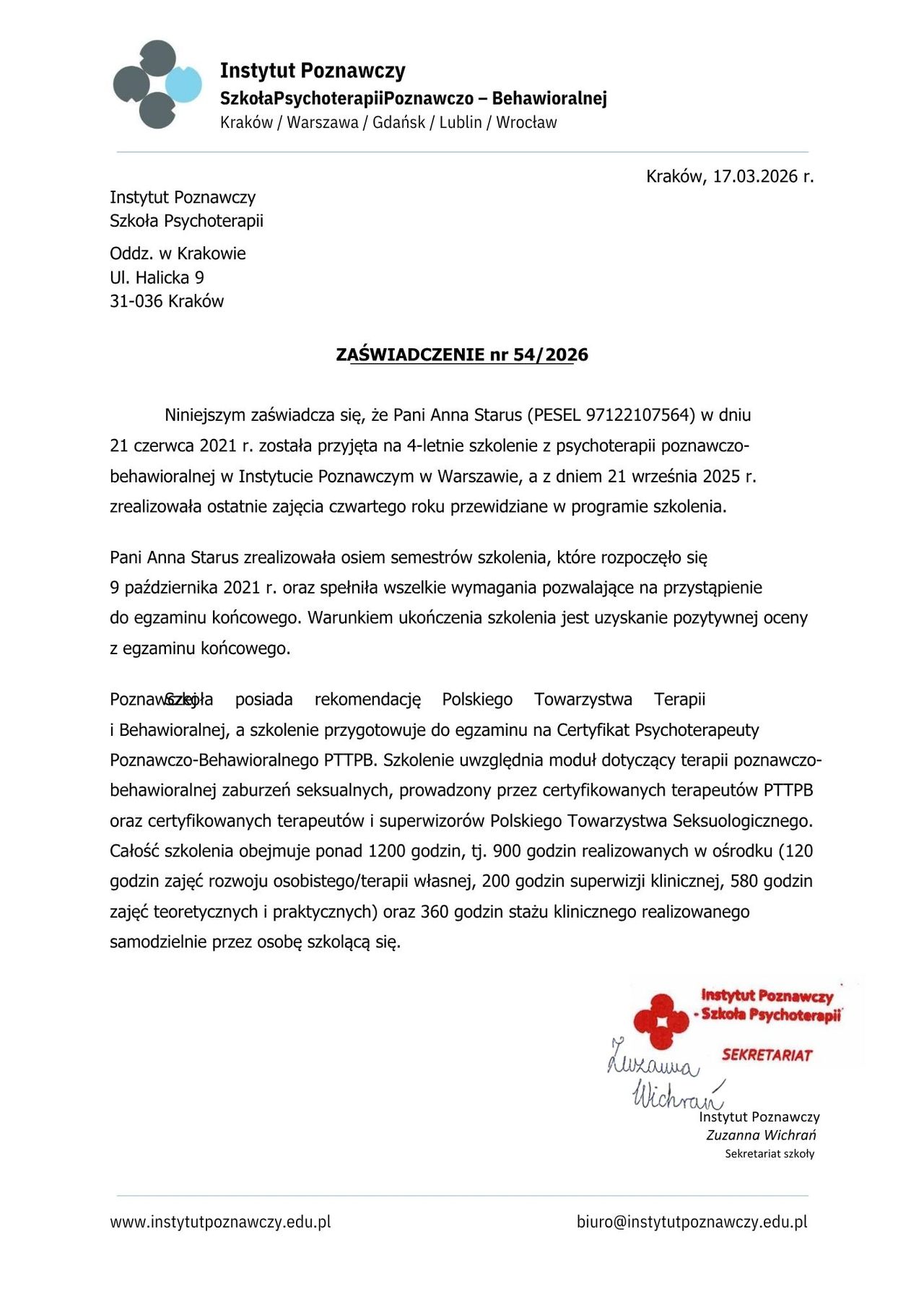 Regularnie uczestniczę w superwizji i pracuję w ramach zespołu konsultacyjnego, stale poszerzam kompetencje. Należę do Polskiego Towarzystwa Terapii Poznawczo-Behawioralnej oraz Polskiego Towarzystwa Terapii Dialektyczno-Behawioralnej. Pracuję zgodnie z zasadami Kodeksu Etyczno-Zawodowego Psychologa oraz Kodeksu Etycznego Terapeuty Poznawczo-Behawioralnego.