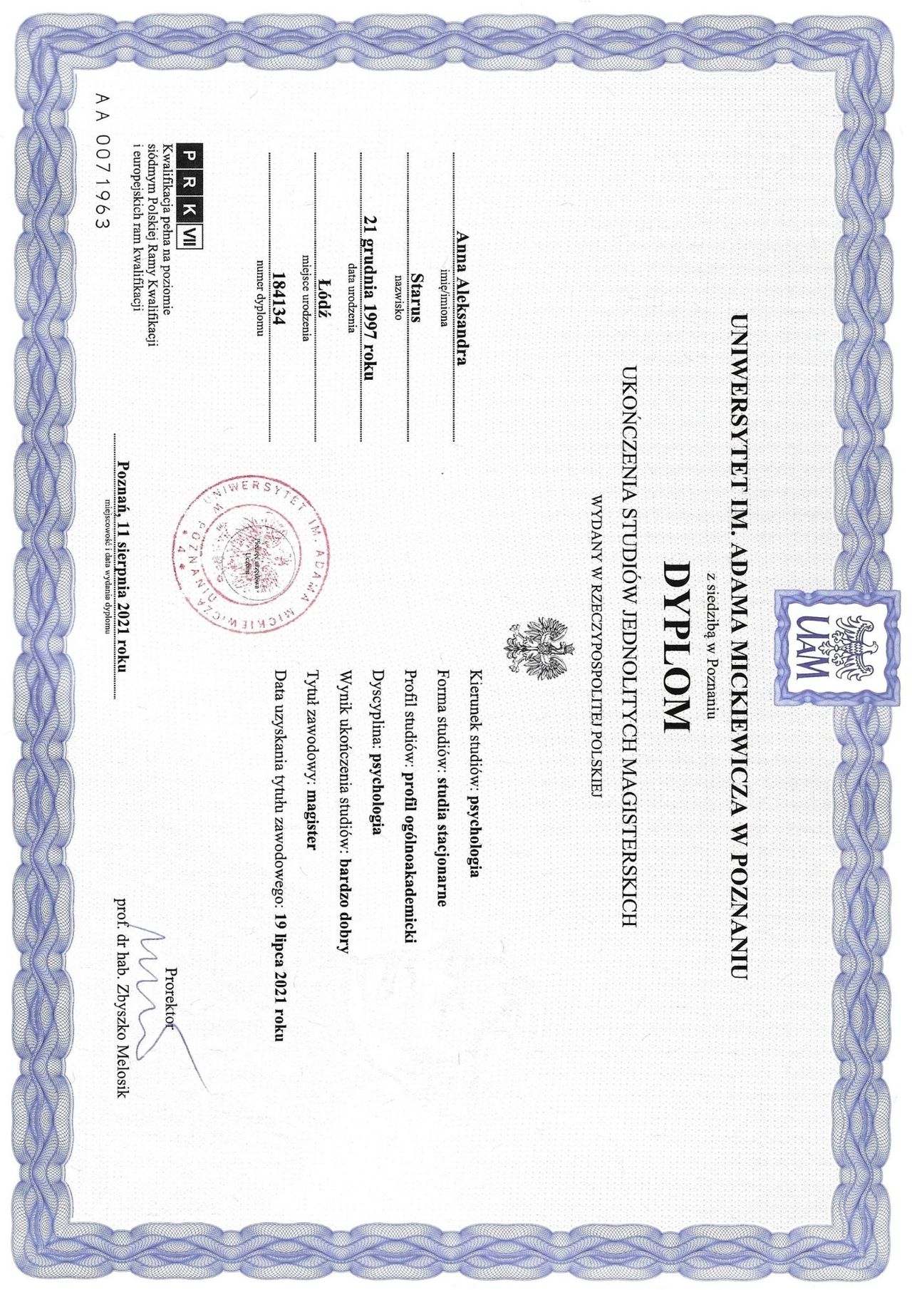 Ukończyłam psychologię na Uniwersytecie im. Adama Mickiewicza w Poznaniu, następnie całościowe, czteroletnie szkolenie psychoterapeutyczne w Instytucie Poznawczym w Warszawie, a także roczne szkolenie DBT Comprehensive z terapii dialektyczno-behawioralnej.