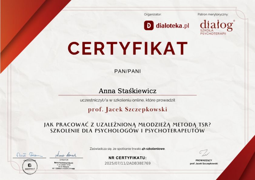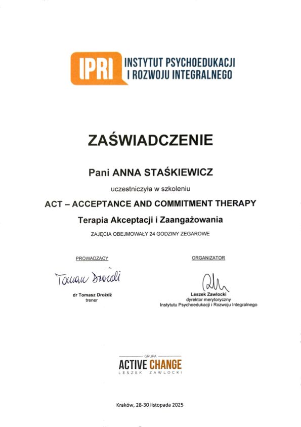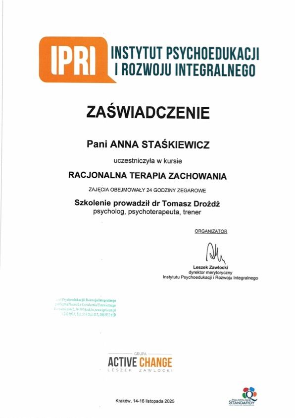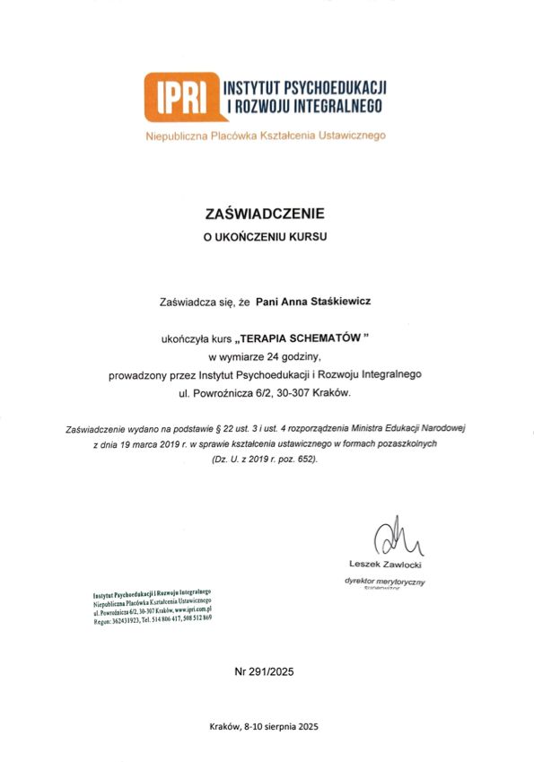Swoje kwalifikacje poszerzam poprzez udział w licznych kursach i szkoleniach. Ukończyłam m. in. szkolenia z zakresu Terapii Schematów, Racjonalnej Terapii Zachowań (RTZ), Terapii Akceptacji i Zaangażowania (ACT), Terapii Skoncentrowanej na Rozwiązaniach (TSR) oraz całościowej diagnozy ADHD u osób dorosłych. W pracy korzystam również z wiedzy zdobytej w zakresie podejścia poznawczo-behawioralnego (CBT). Regularnie uczestniczę w konferencjach, webinarach i interwizjach, dbając o rozwój zawodowy i wysoką jakość swojej pracy.