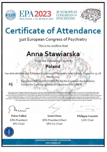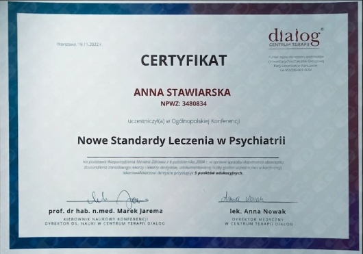 • Nieustannie poszerzam swoją wiedzę, biorąc udział w konferencjach, kursach oraz szkoleniach zawodowych o tematyce psychiatrycznej.