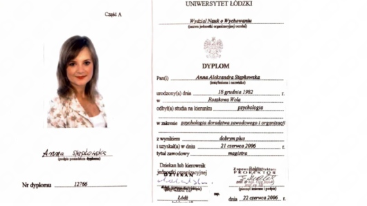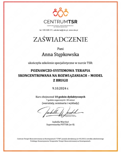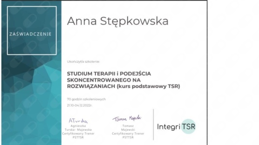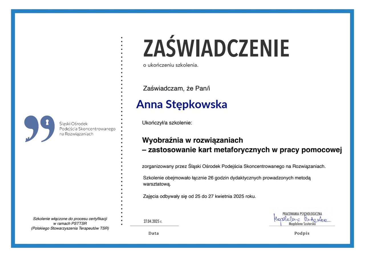 Z wykształcenia jestem psycholożką (Uniwersytet Łódzki, specjalność: psychologia doradztwa zawodowego i organizacji). Ukończyłam szkolenie INTEGRI TSR – Studium Terapii i Podejścia Skoncentrowanego na Rozwiązaniach (stopień I i II), a także liczne kursy specjalistyczne m.in. z terapii poznawczo-behawioralnej, terapii par, interwencji kryzysowej i poznawczo-systemowego modelu TSR z Brugii. Moją pracę regularnie superwizuję.