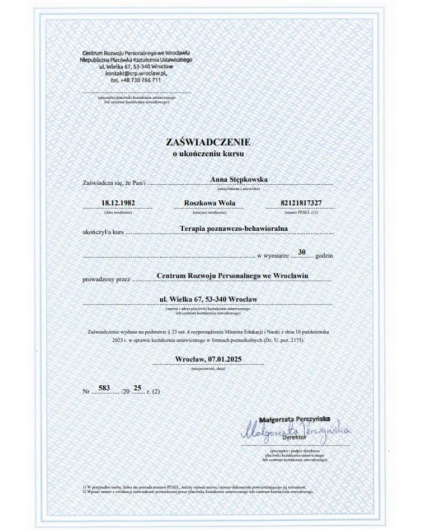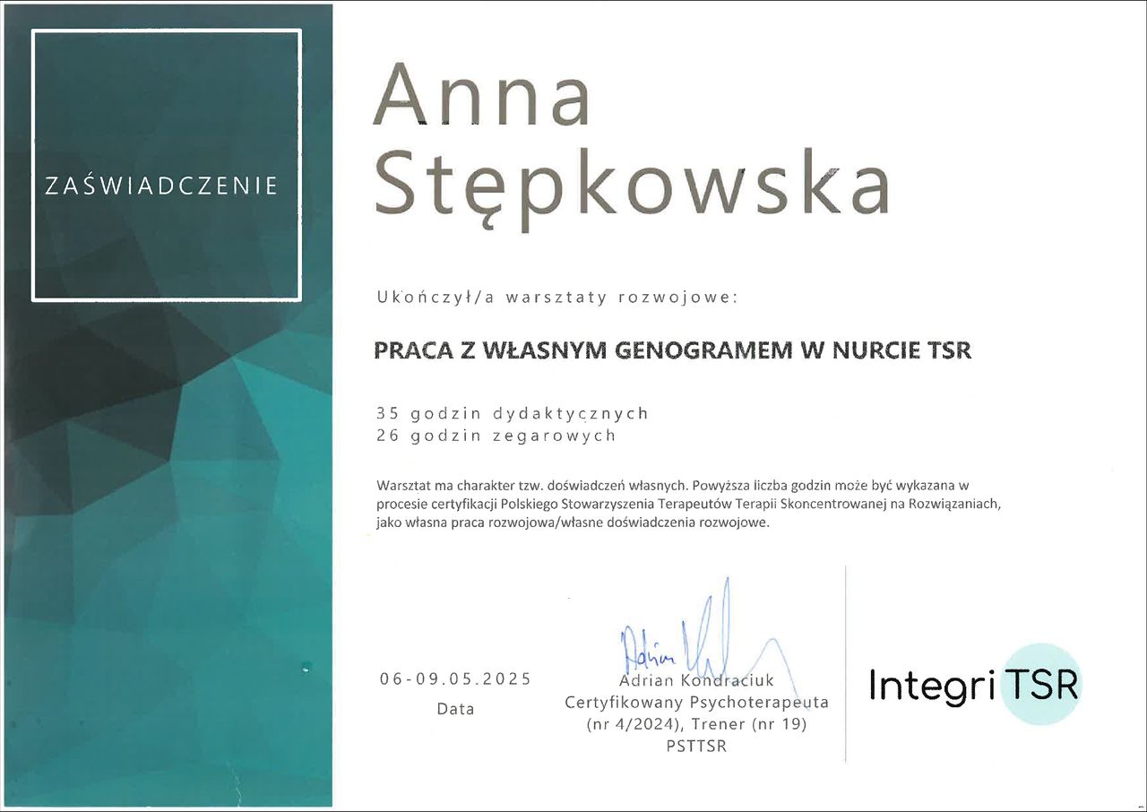 Pani Anna Stępkowska to wyjątkowa psychoterapeutka, która potrafi stworzyć atmosferę pełną zrozumienia, empatii i bezpieczeństwa. Już od pierwszych spotkań czuć, że jest osobą niezwykle kompetentną i zaangażowaną w swoją pracę. Potrafi słuchać z uwagą i zrozumieniem, a jej trafne pytania i wskazówki pomagają odkrywać i lepiej rozumieć własne emocje oraz mechanizmy działania.