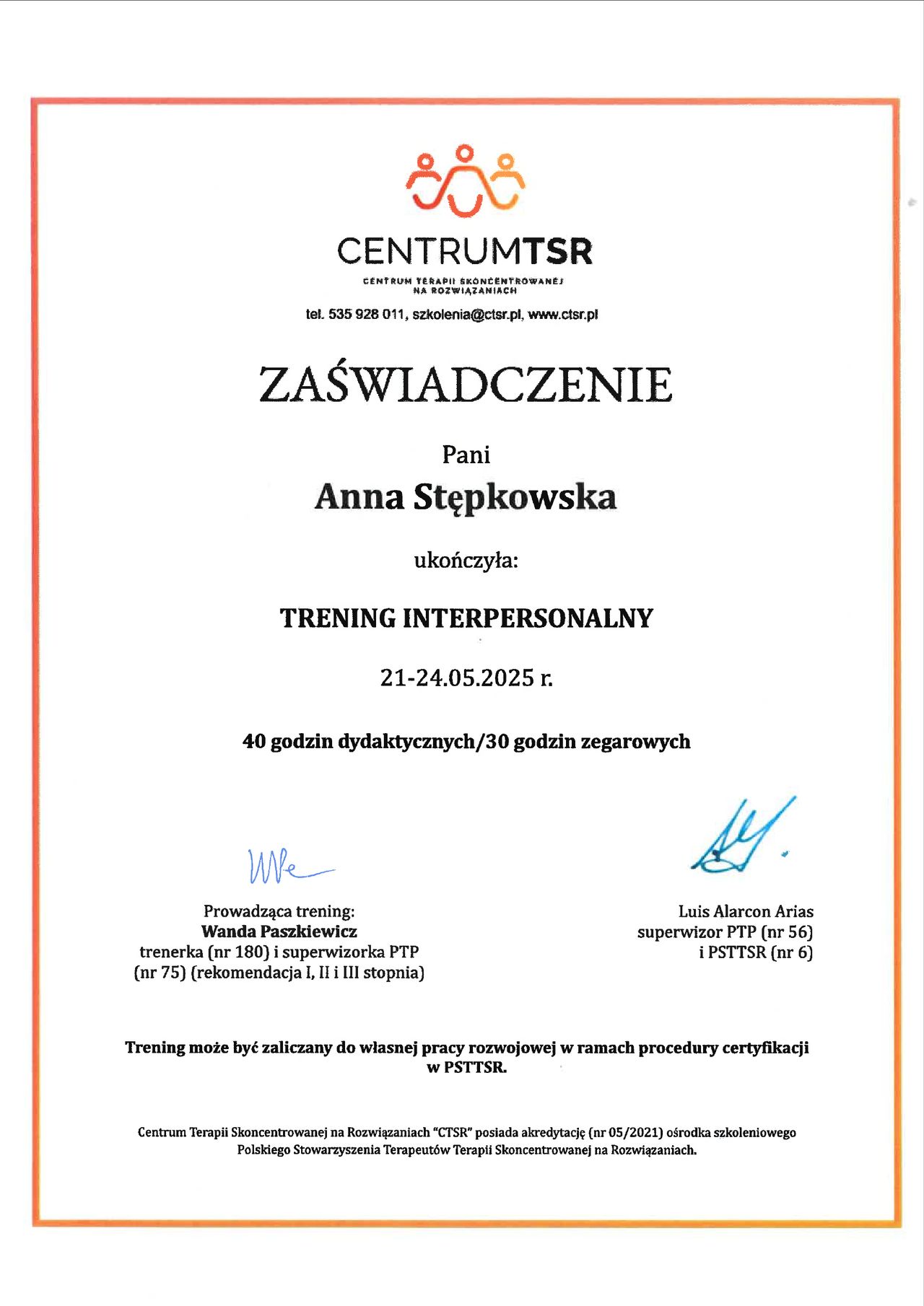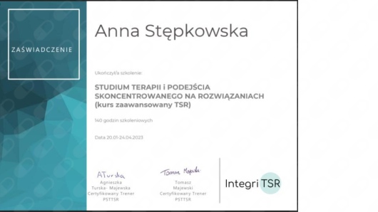 Jestem członkinią Polskiego Towarzystwa Psychologicznego (PTP) oraz Polskiego Stowarzyszenia Terapeutów Terapii Skoncentrowanej na Rozwiązaniach (PSTTSR).