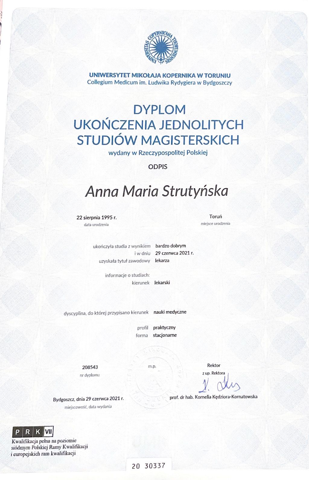 Ukończyłam studia na Wydziale Lekarskim w Collegium Medicum w Bydgoszczy w 2021 roku oraz studia podyplomowe z prawa medycznego i bioetyki na Uniwersytecie Jagiellońskim.