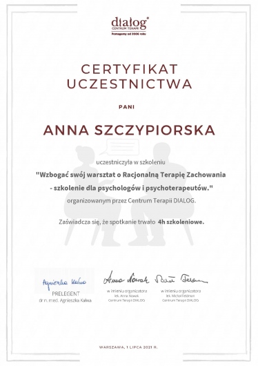Jestem bardzo zadowolona z rozmów z panią Anną. Jest ona osoba bardzo miłą, spokojna, potrafi trafnie znaleźć źródło problemu i pokierować dalej. Doceniam jej profesjonalne podejscie i pełne zaangażowanie, czułam że poświęcała mi całą uwagę. Dzięki niej mogłam też pracować nad swoim problemem, ponieważ dostawałam różne zadania do wykonania (brakowało mi tego u poprzedniego terapeuty). Polecam szczerze wszystkim!