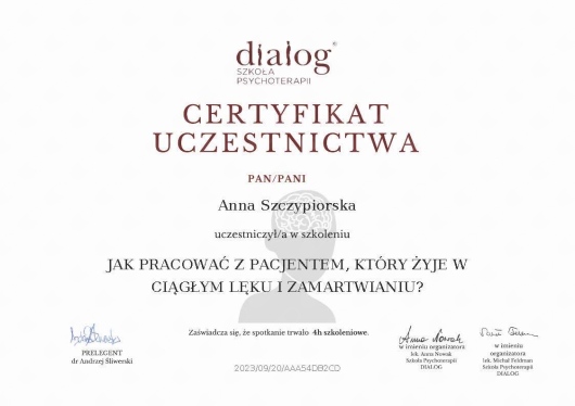 Pani Anna jest bardzo zaangażowana, uważnie słucha, zadaje dużo pytań. Tworzy bardzo przyjazną atmosferę, w której można się otworzyć. Poza wizytą poleca też książki, strony, wysyła ćwiczenia. Bardzo polecam. Obawiałam się pierwszej wizyty, a wszystko super przebiegło, nie było już później żadnego stresu.