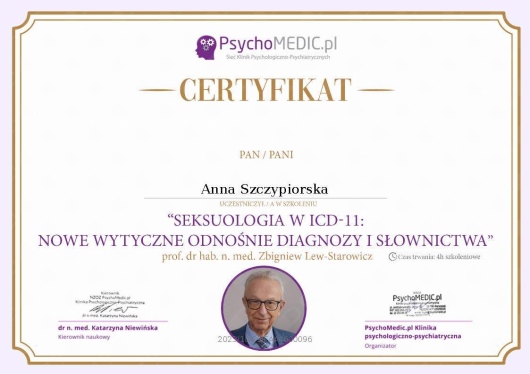 Jestem psychologiem z wykształceniem magisterskim, o specjalizacji terapia oraz terapia seksualna, absolwentką 5-letnich studiów na wydziale psychologii WSFiZ w Warszawie (obecnie Akademia Ekonomiczno-Humanistyczna). Moja praca zawodowa to ciągły proces rozwoju, dlatego regularnie uczestniczę w szkoleniach, warsztatach oraz studiach podyplomowych.