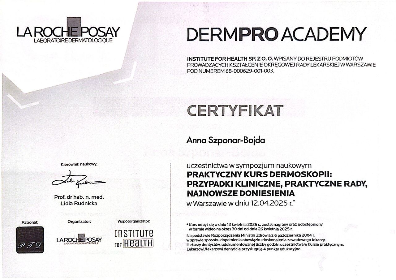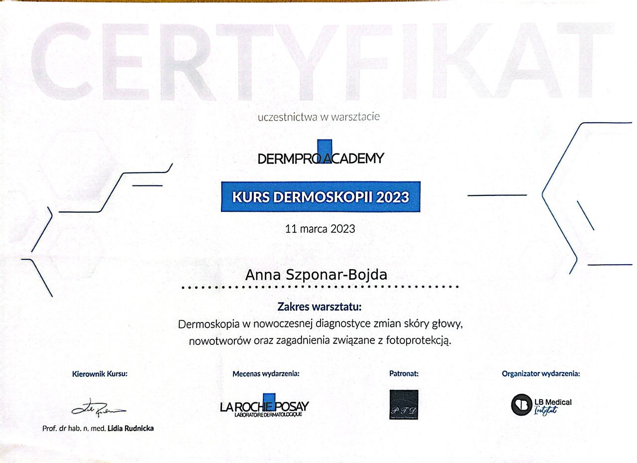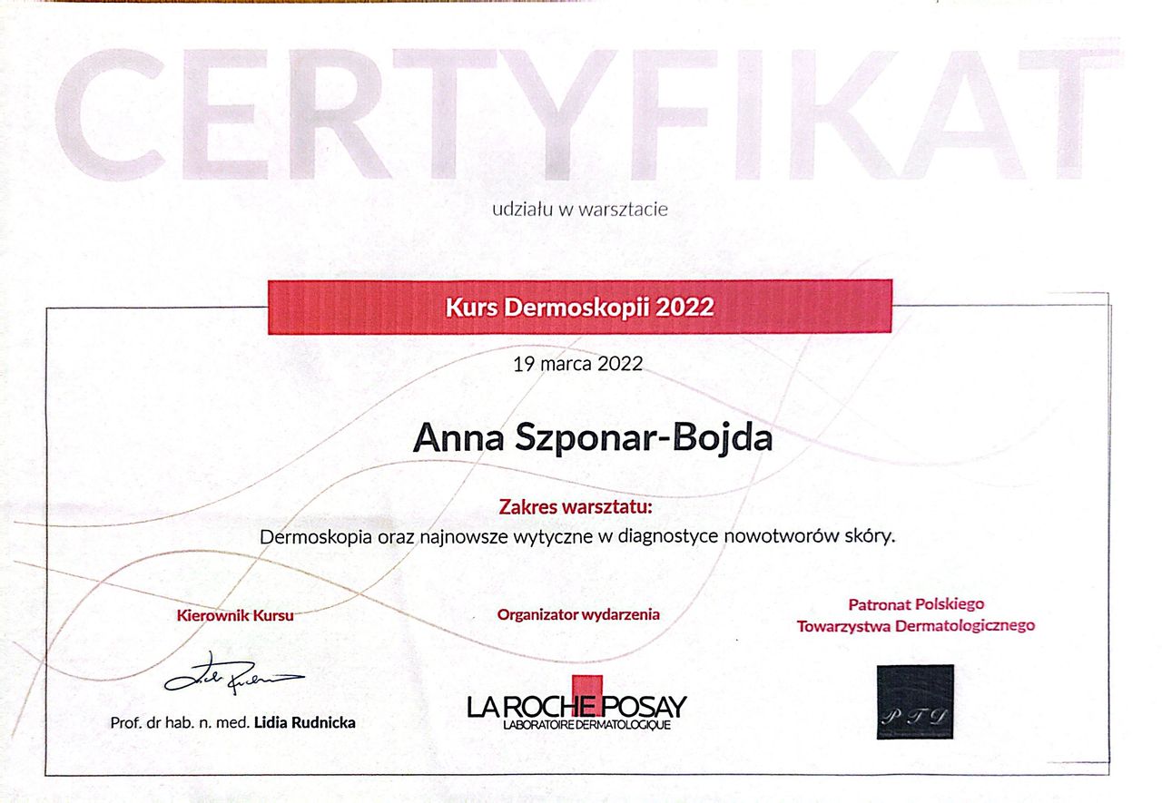 Dermatoskopia jest badaniem stosowanym do oceny znamion barwnikowych, powszechnie nazywanych pieprzykami. Ta metoda zwiększa możliwość rozpoznania czerniaka w bardzo wczesnym stadium rozwoju, wtedy, gdy można ten nowotwór łatwo wyleczyć. Ponadto ułatwia odróżnienie czerniaka złośliwego od innych, niegroźnych zmian na skórze. Jest badaniem bezinwazyjnym, dzięki czemu jest w pełni bezpieczna i bezbolesna dla pacjenta.