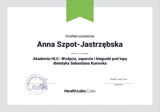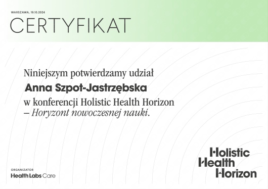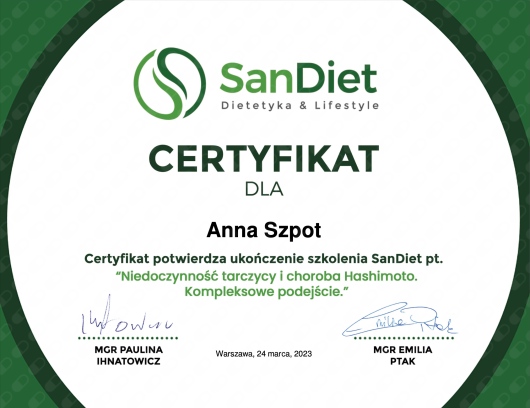 Nazywam się Anna Szpot-Jastrzębska. Jestem dietetykiem klinicznym. Tworzę indywidualne jadłospisy oraz zalecenia żywieniowe dla osób zdrowych, kobiet w ciąży oraz osób z chorobami dietozależnymi. Pomagam w nauce zdrowych nawyków żywieniowych w prosty i przyjemny sposób. - Otyłość i nadwaga - Choroby tarczycy (niedoczynność tarczycy, nadczynność tarczycy, Hashimoto, choroba Gravesa-Basedowa) - Zaburzenia gospodarki węglowodanowej (hipoglikemia reaktywna, insulinooporność, cukrzyca typu 2) - Endometrioza - PCOS - Nadciśnienie tętnicze - IBS - SIBO/IMO - Niedokrwistość - RZS - Zaburzenia hormonalne - Zaburzenia lipidowe W razie pytań zapraszam do kontaktu. UWAGA! Nie wykonuję pomiarów składu ciała w swoim gabinecie.