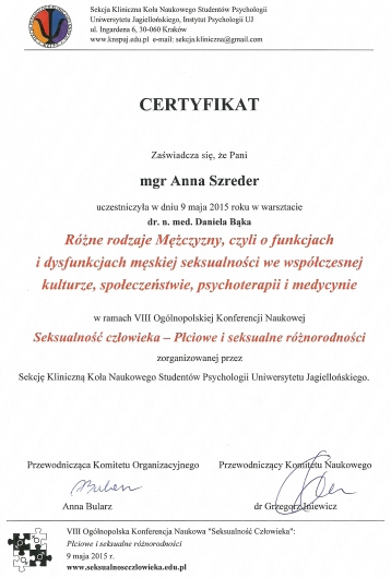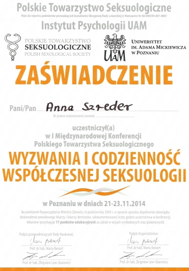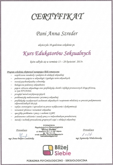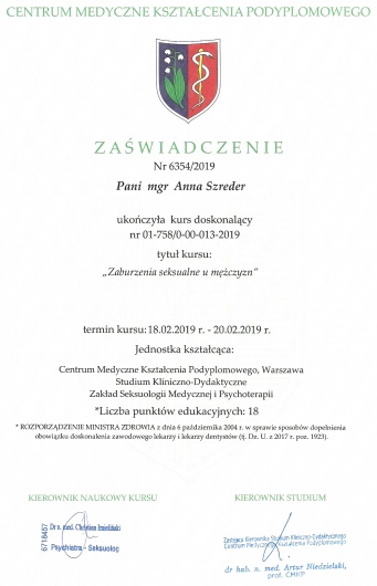 Jestem członkinią Polskiego Stowarzyszenia Terapeutów Terapii Skoncentrowanej na Rozwiązaniach oraz Polskiego Towarzystwa Seksuologicznego.