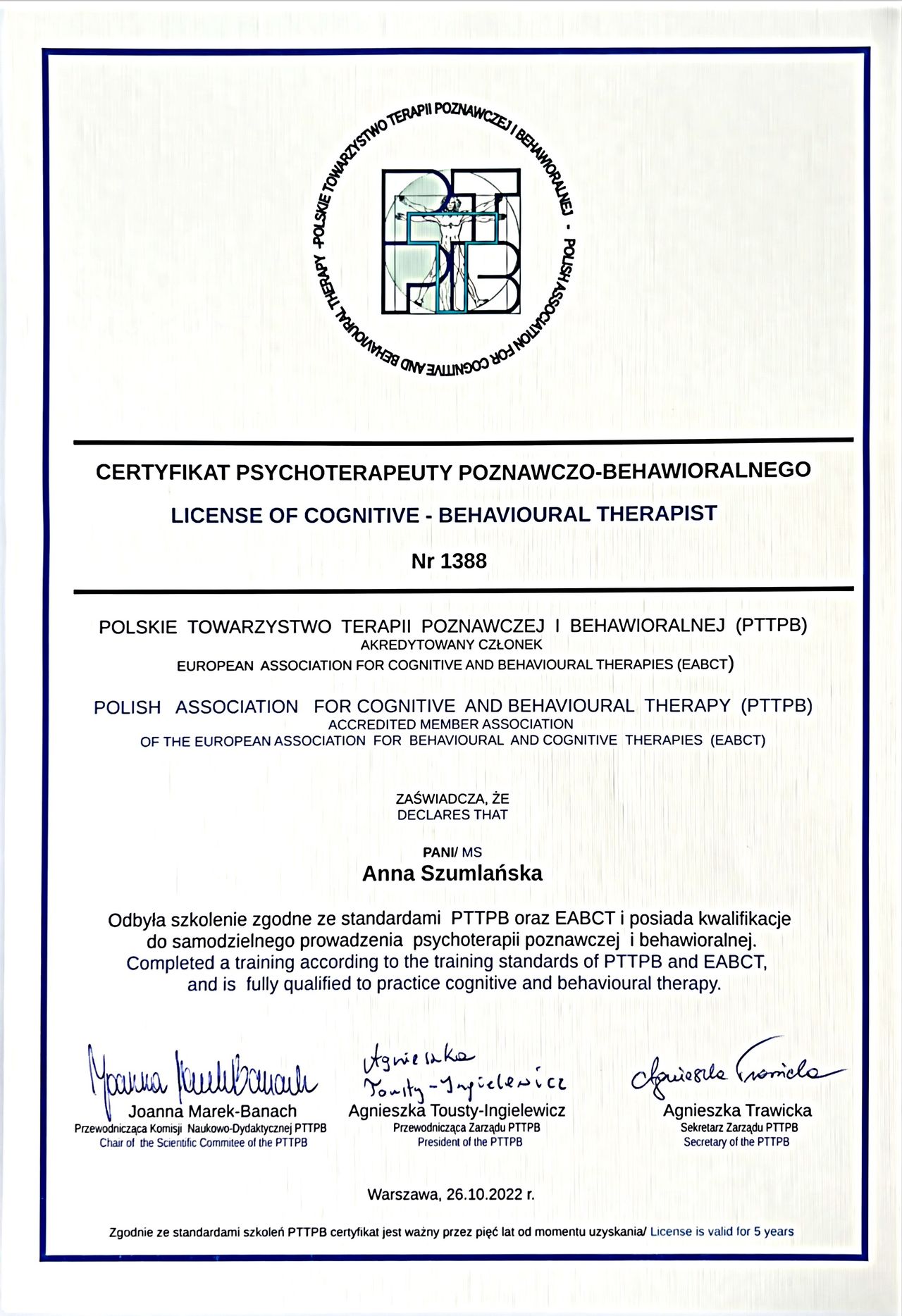 Jestem certyfikowanym psychoterapeutą poznawczo-behawioralnym. Ukończyłam studia psychologiczne na Uniwersytecie Jagiellońskim w Krakowie. Pracuję z osobami dorosłymi. Specjalizuję się w pracy z zaburzeniami lękowymi. Po więcej informacji zapraszam na stronę