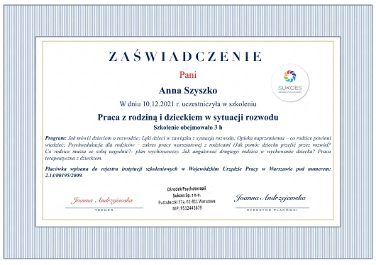 Jestem psychologiem, psychoterapeutą w trakcie szkolenia oraz pedagogiem specjalnym.