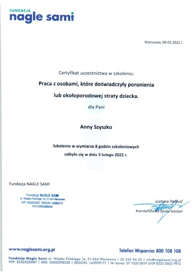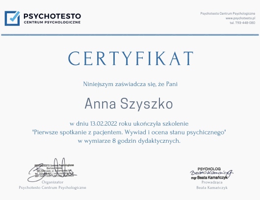 Chcąc wzbogacić wiedzę oraz rozwinąć kompetencje zawodowe w 2022 r. rozpoczęłam 4-letnie szkolenie z psychoterapii poznawczo-behawioralnej w ośrodku, który posiada rekomendację Polskiego Towarzystwa Terapii poznawczej i Behawioralnej. Jestem pewna, że wiedza oraz umiejętności, które zdobędę podczas szkolenia pozwolą mi zadbać o każdego pacjenta.