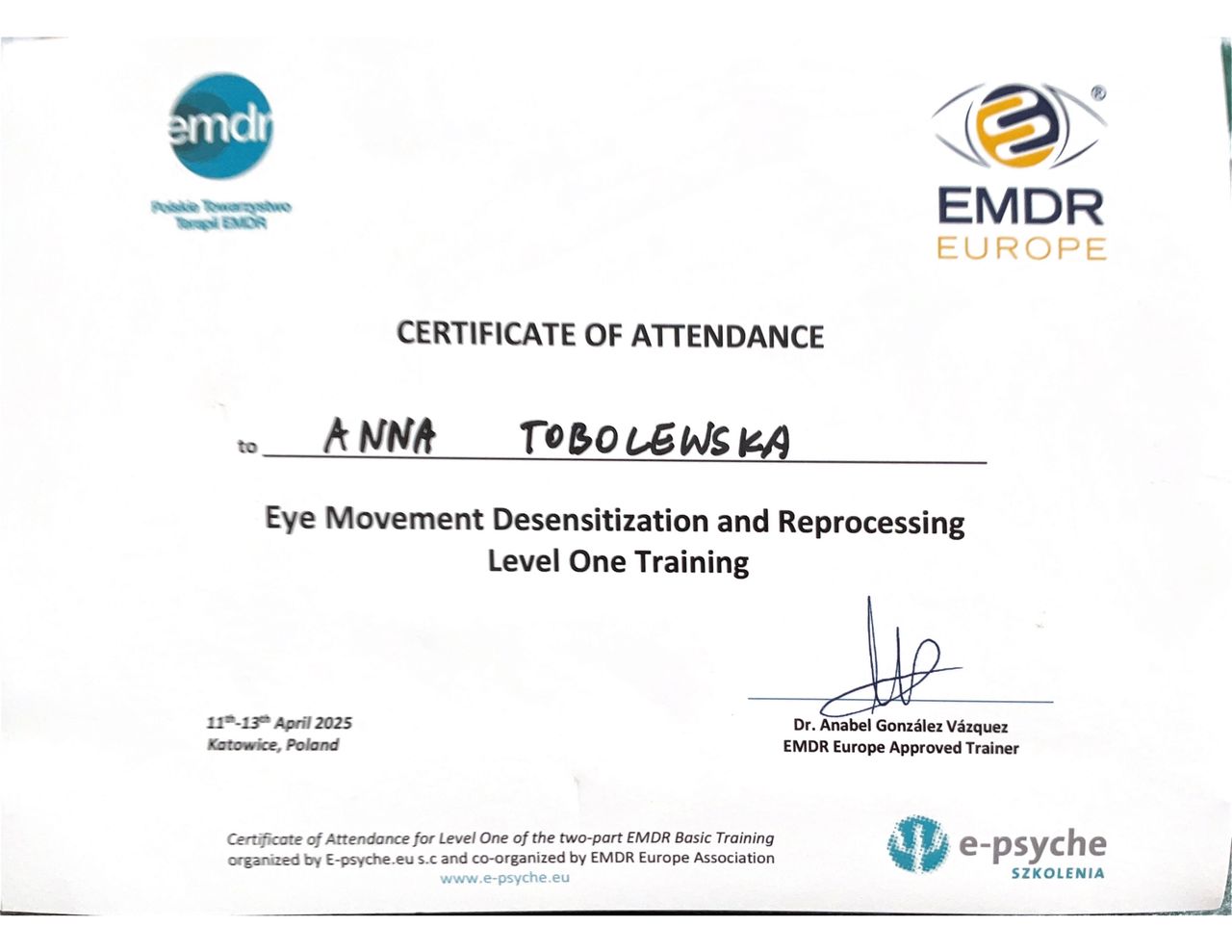 Jestem psycholożką, certyfikowaną psychoterapeutką poznawczo-behawioralną (Certyfikat PTTPB nr 2108) i terapeutką EMDR. Wspieram w sytuacji kryzysu, prowadzę terapię zaburzeń psychicznych, pomagam przy trudnościach.