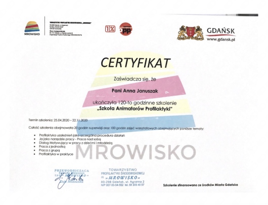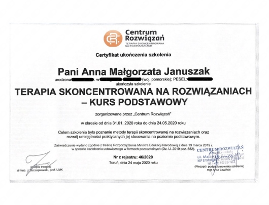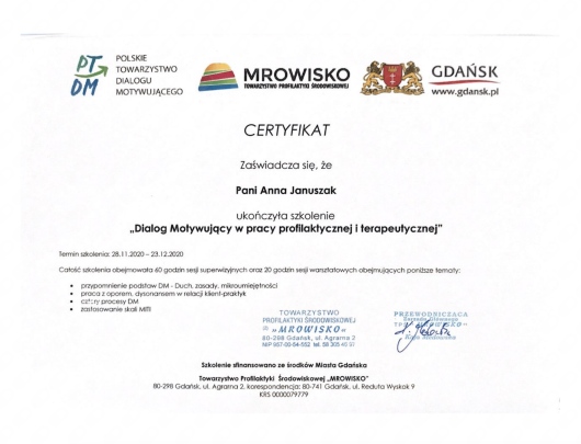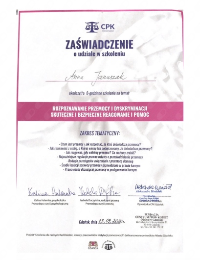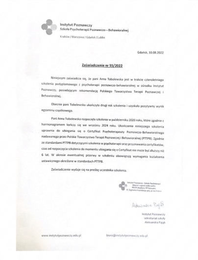 Studia magisterskie ukończyłam na Uniwersytecie Gdańskim (Psychologia, Wydział Nauk Społecznych) o specjalnościach psychologia kliniczna oraz psychologia dzieci i młodzieży. Następnie odbyłam I stopień kursu Terapii Skoncentrowanej na Rozwiązaniach oraz poziom podstawowy i rozszerzony szkolenia z Dialogu Motywującego. Potem ukończyłam 4-letnią szkołę psychoterapii w Instytucie Poznawczym (szkole psychoterapii poznawczo-behawioralnej, akredytowanej przez Polskie Towarzystwo Terapii Poznawczo-Behawioralnej). Niedawno ukończyłam również szkolenie podstawowe z terapii EMDR (metoda psychoterapii, która pomaga przetwarzać traumatyczne wspomnienia.) Jestem członkinią Polskiego Towarzystwa Terapii Poznawczo-Behawioralnej (PTTPB) oraz Polskiego Towarzystwa EMDR (PTT EMDR). Regularnie biorę udział w różnych szkoleniach, webinarach i konferencjach.