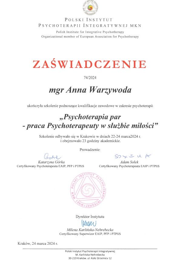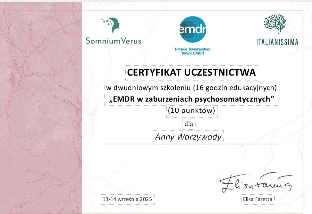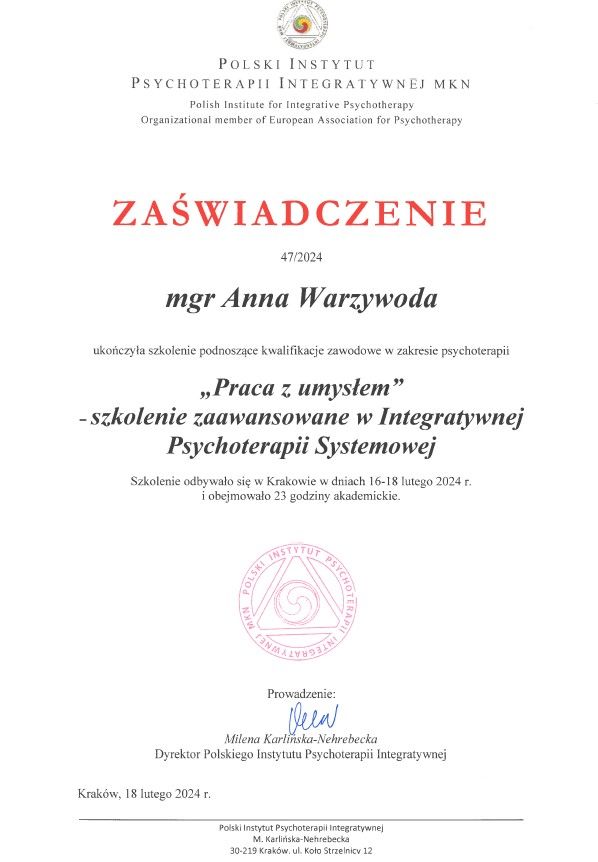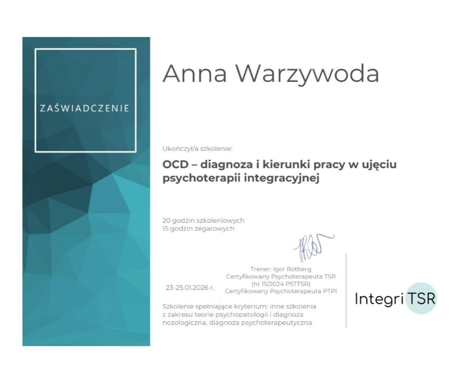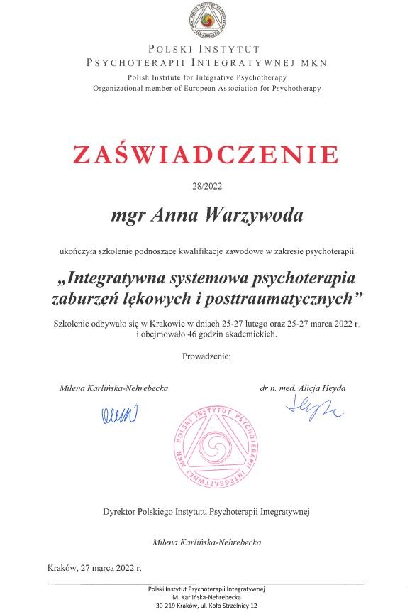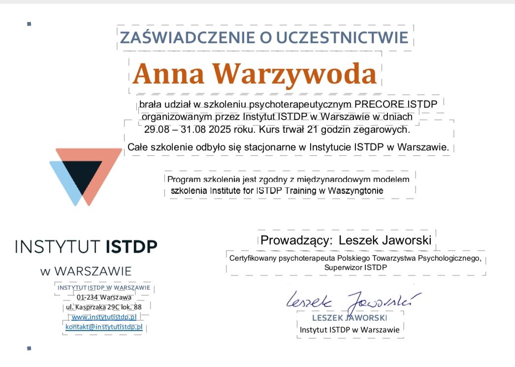 Prowadzę psychoterapię dla osób powyżej 18 roku życia, par i rodzin. W swojej pracy korzystam z podejścia dostosowanego do indywidualnych potrzeb pacjenta, integrując różne kierunki psychoterapii w oparciu o teorię integratywną systemową. Wykorzystuję m.in. elementy podejścia psychodynamicznego, poznawczo-behawioralnego, systemowego, hipnozy, pracy z ciałem, oddechem oraz technik pracy z umysłem. W swojej pracy wykorzystuję również metodę EMDR - terapię zorientowaną na traumę oraz elementy ISTDP (Intensywna Krótkoterminowa Psychoterapia Psychodynamiczna). Swoją pracę na bieżąco superwizuję u certyfikowanych superwizorów. Jestem też członkiem Polskiego Towarzystwa Psychoterapii Integratywnej (PTPI) oraz Polskiego Towarzystwa Terapii EMDR.