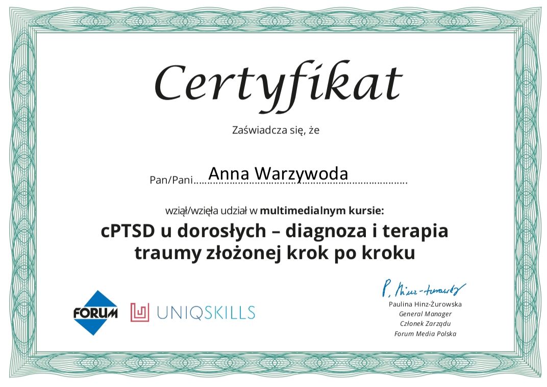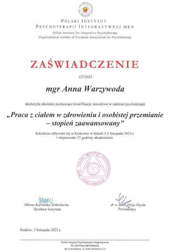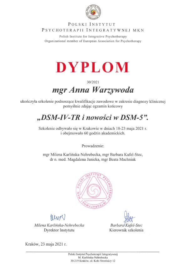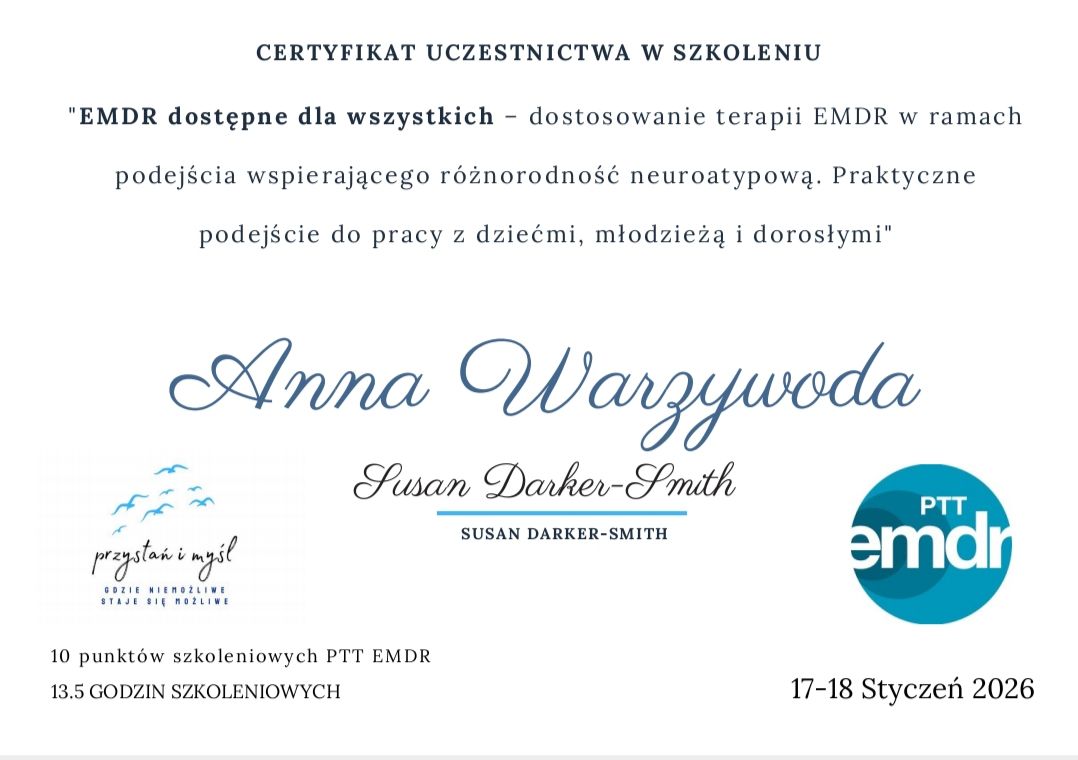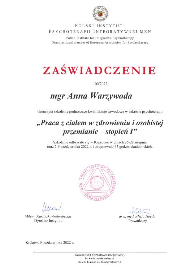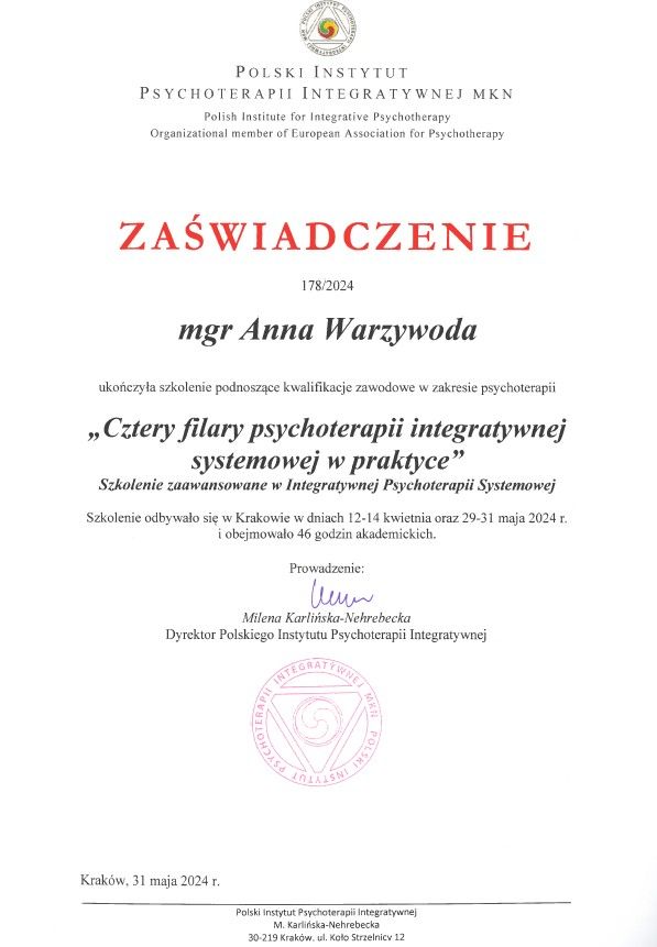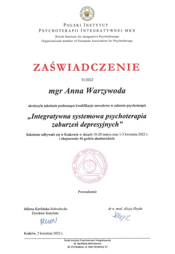 Prowadzę psychoterapię dla osób powyżej 18 roku życia, par i rodzin. W swojej pracy korzystam z podejścia dostosowanego do indywidualnych potrzeb pacjenta, integrując różne kierunki psychoterapii w oparciu o teorię integratywną systemową. Wykorzystuję m.in. elementy podejścia psychodynamicznego, poznawczo-behawioralnego, systemowego, hipnozy, pracy z ciałem, oddechem oraz technik pracy z umysłem. W swojej pracy wykorzystuję również metodę EMDR - terapię zorientowaną na traumę oraz elementy ISTDP (Intensywna Krótkoterminowa Psychoterapia Psychodynamiczna). Swoją pracę na bieżąco superwizuję u certyfikowanych superwizorów. Jestem też członkiem Polskiego Towarzystwa Psychoterapii Integratywnej (PTPI) oraz Polskiego Towarzystwa Terapii EMDR.