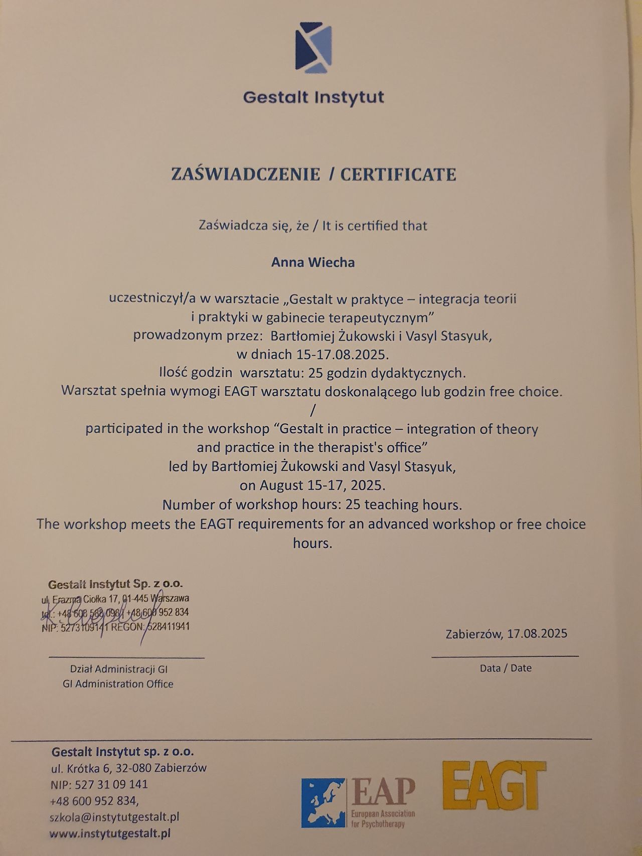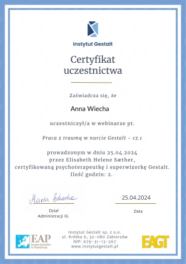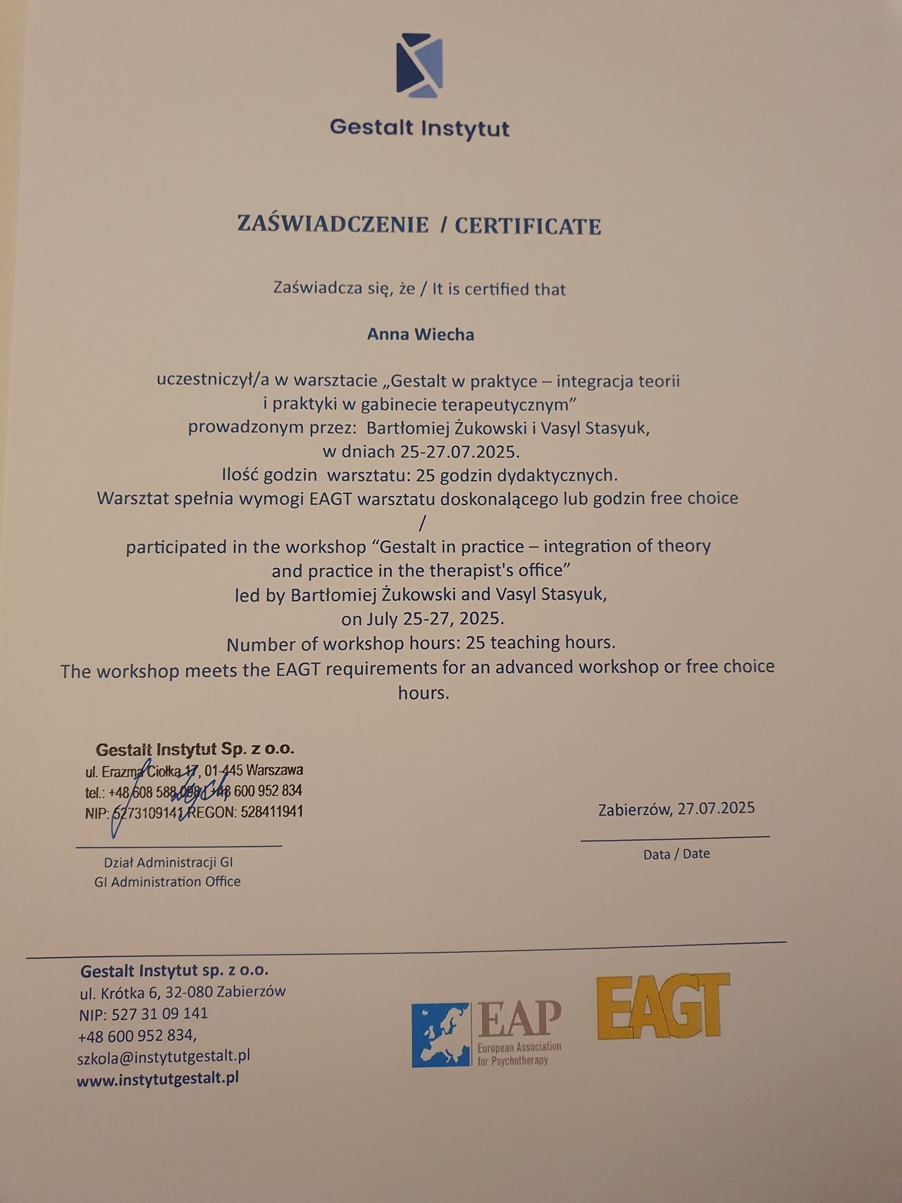 Jestem psychoterapeutką w trakcie certyfikacji,ukończyłam czteroletnie szkolenia w Gestalt Instytut w Krakowie. Gestalt Instytut jest akredytowany przez Europejskie Stowarzyszenie Psychoterapii Gestalt, PolskieTowarzystwa Psychoterapii Gestalt. Udzielam wsparcia w trudnych sytuacjach życiowych, jak np. problemy w relacji, związku, rozstanie, brak poczucia własnej wartości, żałoba wypalenie zawodowe, mobbing , ataki paniki, lęk, depresja nadmierne napięcie. Towarzyszę osobom borykającym się z trudnymi emocjami, sztywnymi schematami i relacjami. Jeśli potrzebujesz wsparcia w poszukaniu siebie, odkryciu swoich potrzeb, poczucia własnej wartości, jeśli chcesz lepiej zrozumieć swoje zachowania i mechanizmy obronne, to przyjdź. Zapraszam Cię serdecznie! Dam swoją obecność, czas, wsparcie i bezpieczną przestrzeń do poszukania Siebie. Kompetencje : Swoje kompetencje poszerzam poprzez udział w warsztatach, treningach terapeutycznych, webinarach (m.in.” Praca z traumą”,” Wstyd w ujęciu relacyjnym”,) a także psychoterapii własnej. Staż odbyłam w Katedrze i Oddziale Klinicznym Psychiatrii w Tarnowskich Górach. Pracuję pod regularną superwizją i w zgodzie z zasadami Kodeksu Etyki Zawodowej. Ukończyłam Śląski Uniwersytet Medyczny. A Gestalt to..... „Gestalt to przede wszystkim pogłębiony kontakt z człowiekiem. To spotkanie oparte na przyjęciu i akceptacji. To towarzyszenie w tym, co chce dla siebie zmienić, jak chce poznać lub zaakceptować to, jak jest. To kontakt z Kimś, kto ma swoje własne doświadczenia, perspektywę, mocne i słabe strony, Kto jest całością- z emocjami, duszą i ciałem „ Gro Skottun, Ashild Kruger, Praktyka Terapii Gestalt.