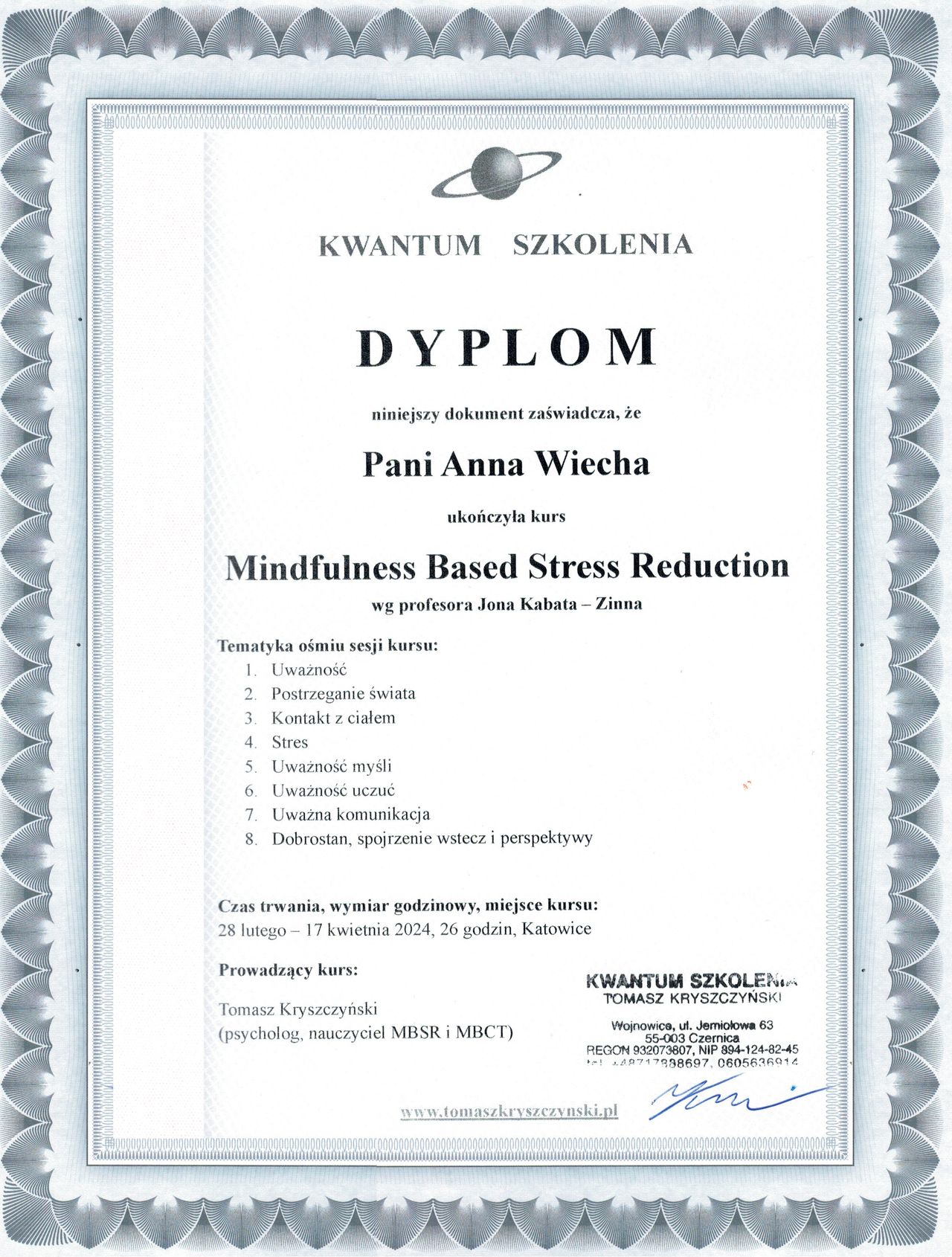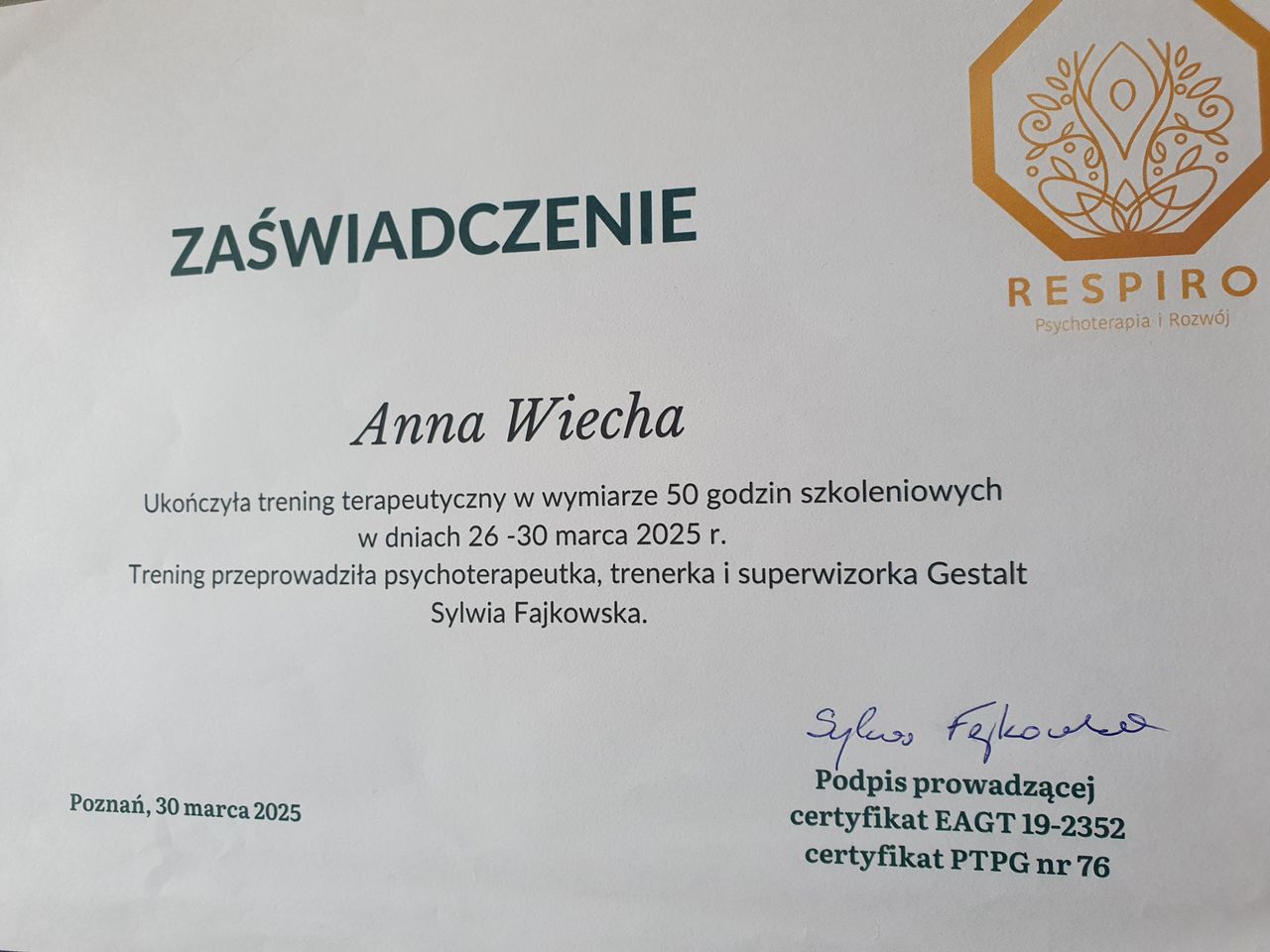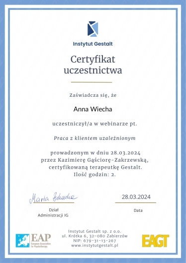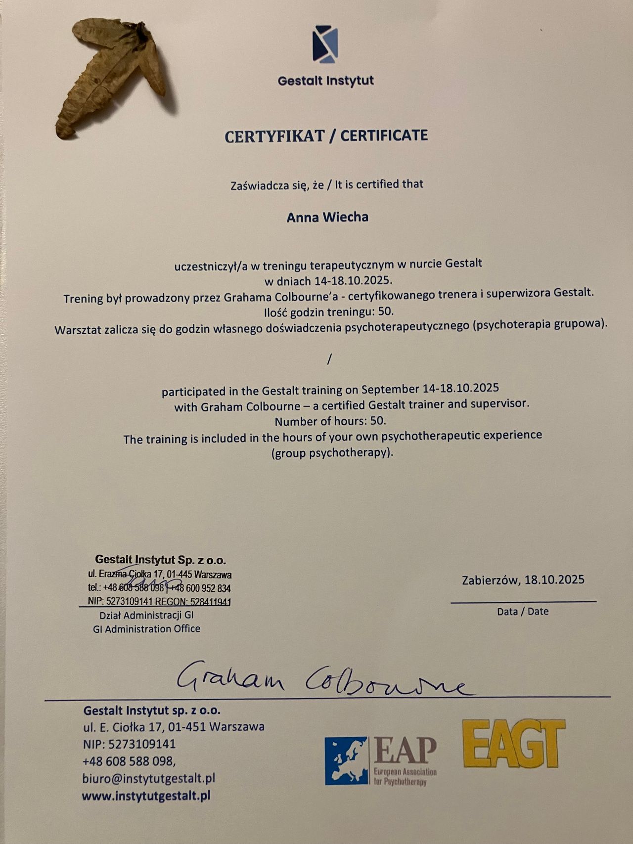 Jestem psychoterapeutką w trakcie certyfikacji,ukończyłam czteroletnie szkolenia w Gestalt Instytut w Krakowie. Gestalt Instytut jest akredytowany przez Europejskie Stowarzyszenie Psychoterapii Gestalt, PolskieTowarzystwa Psychoterapii Gestalt. Udzielam wsparcia w trudnych sytuacjach życiowych, jak np. problemy w relacji, związku, rozstanie, brak poczucia własnej wartości, żałoba wypalenie zawodowe, mobbing , ataki paniki, lęk, depresja nadmierne napięcie. Towarzyszę osobom borykającym się z trudnymi emocjami, sztywnymi schematami i relacjami. Jeśli potrzebujesz wsparcia w poszukaniu siebie, odkryciu swoich potrzeb, poczucia własnej wartości, jeśli chcesz lepiej zrozumieć swoje zachowania i mechanizmy obronne, to przyjdź. Zapraszam Cię serdecznie! Dam swoją obecność, czas, wsparcie i bezpieczną przestrzeń do poszukania Siebie. Kompetencje : Swoje kompetencje poszerzam poprzez udział w warsztatach, treningach terapeutycznych, webinarach (m.in.” Praca z traumą”,” Wstyd w ujęciu relacyjnym”,) a także psychoterapii własnej. Staż odbyłam w Katedrze i Oddziale Klinicznym Psychiatrii w Tarnowskich Górach. Pracuję pod regularną superwizją i w zgodzie z zasadami Kodeksu Etyki Zawodowej. Ukończyłam Śląski Uniwersytet Medyczny. A Gestalt to..... „Gestalt to przede wszystkim pogłębiony kontakt z człowiekiem. To spotkanie oparte na przyjęciu i akceptacji. To towarzyszenie w tym, co chce dla siebie zmienić, jak chce poznać lub zaakceptować to, jak jest. To kontakt z Kimś, kto ma swoje własne doświadczenia, perspektywę, mocne i słabe strony, Kto jest całością- z emocjami, duszą i ciałem „ Gro Skottun, Ashild Kruger, Praktyka Terapii Gestalt.