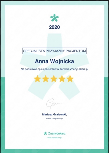 Jak Anna Wojnicka umawia wizyty?Anna Wojnicka używa kalendarza ZnanyLekarz, dlatego na stronie widzisz aktualne terminy. Wystarczy, że wybierzesz datę i godzinę, które odpowiadają Ci najbardziej. Umawianie wizyty jest darmowe, a tuż przed terminem wyślemy Ci przypomnienie.