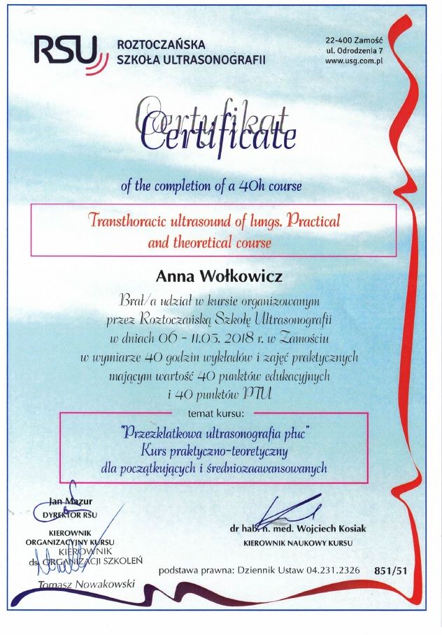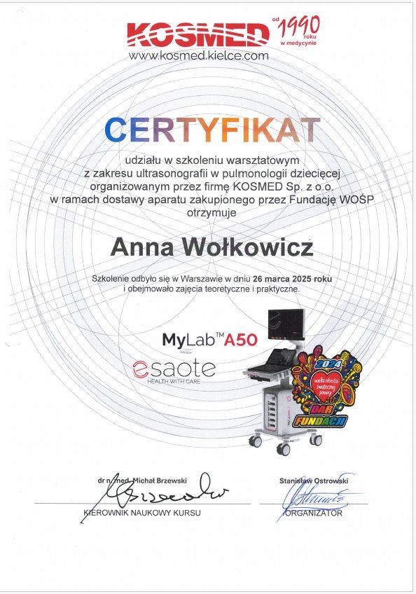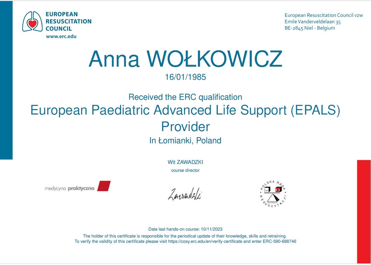 Jestem specjalistką chorób płuc dzieci oraz pediatrii. Lubię pracę z dziećmi i dużą wagę przykładam do nawiązania dobrego kontaktu z małym pacjentem. Dbam o to, żeby wizyta przebiegała w miłej, bezpiecznej dla dziecka atmosferze, unikam pośpiechu. Studia medyczne ukończyłam na II Wydziale Lekarskim Warszawskiego Uniwersytetu medycznego. W 2018 r. uzyskałam tytuł specjalisty w dziedzinie pediatrii, specjalizację odbywałam pracując w Klinice Pediatrii Instytutu Matki i Dziecka. W 2022 r. uzyskałam tytuł specjalisty w dziedzinie chorób płuc dzieci, specjalizację odbywałam w Klinicznym Oddziałem Chorób Płuc - Centrum Leczenia Mukowiscydozy oraz Poradni Mukowiscydozy w Dziekanowie Leśnym, gdzie pracuję do tej pory. Od kilku lat pracuję także w poradni pediatrycznej i poradni pulmonologicznej. Prowadzę konsultacje dzieci od okresu noworodkowego do osiemnastego roku życia. Jestem autorką publikacji w czasopismach medycznych z zakresu pediatrii i pulmonologii, pogłębiam swoją wiedzę uczestnicząc w szkoleniach, kursach i konferencjach. Jestem członkiem Polskiego Towarzystwa Chorób Płuc Dzieci, Polskiego Towarzystwa Pediatrycznego i Polskiego Towarzystwa Mukowiscydozy. Jestem również pracownikiem naukowym Instytutu Matki i Dziecka. Dbam o to, aby moja wiedza była zgodna z najnowszymi standardami diagnostyki i leczenia. Wieloletnie doświadczenie w leczeniu dzieci z chorobami przewlekłymi nauczyło mnie, jak ważna jest próba dostosowania leczenia do preferencji pacjenta i jego trybu życia.