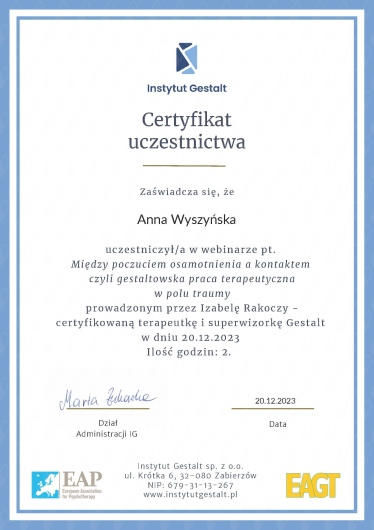 I am currently training at the Gestalt Institute in Kraków, hold a Family Coach certificate, and have experience working with Adult Children of Alcoholics (ACoA) and Dysfunctional Families (DDF). I also collaborate with foundations, supporting personal and professional growth.