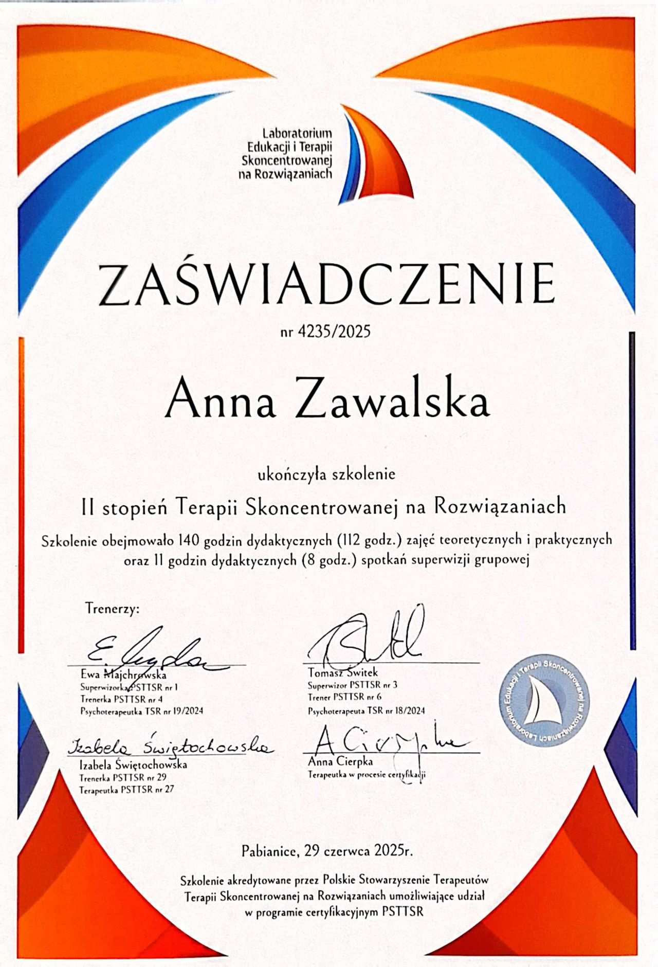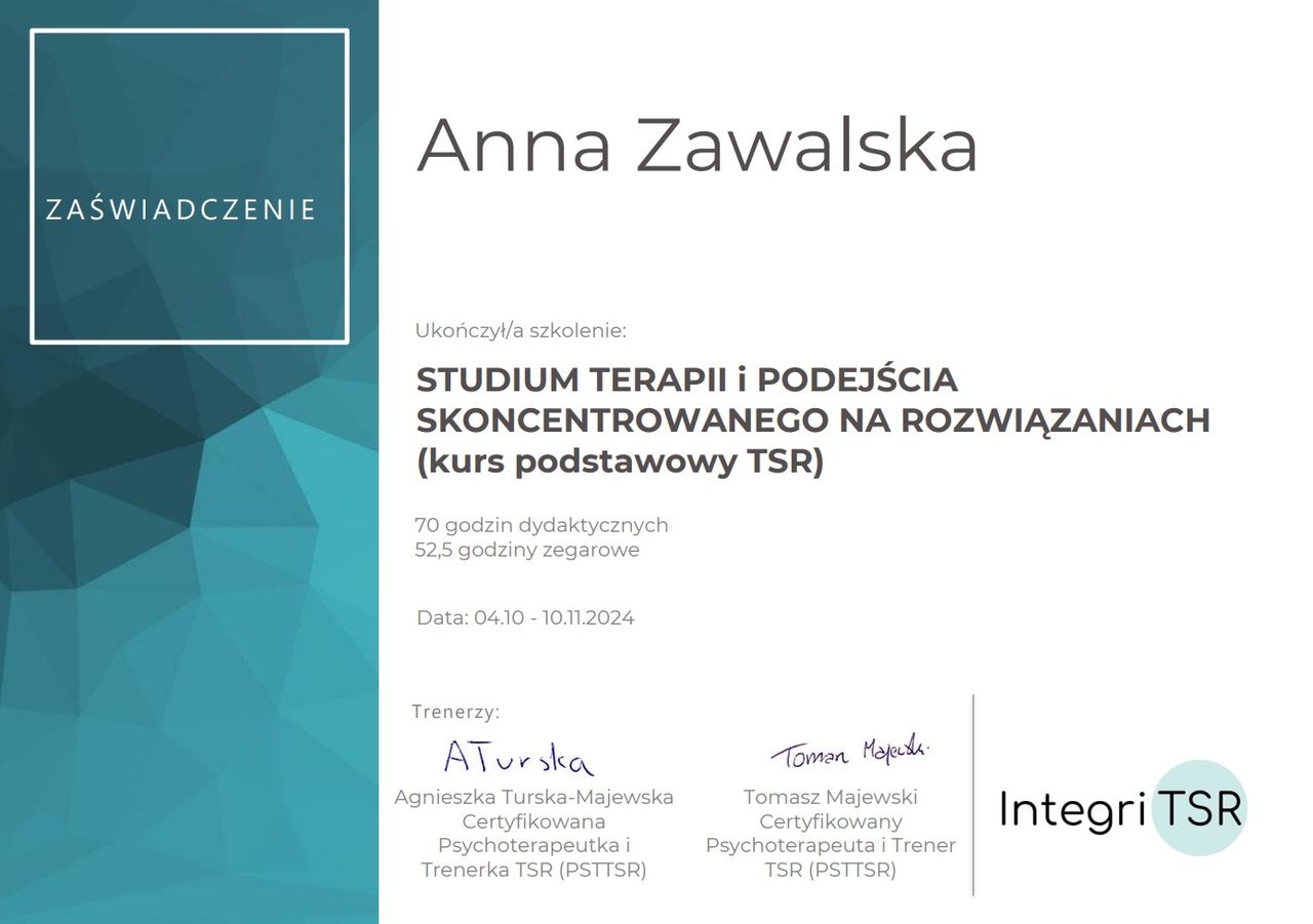W pracy opieram się przede wszystkim na podejściu skoncentrowanym na rozwiązaniach (TSR). Ukończyłam kurs TSR (poziom podstawowy i zaawansowany) Polskiego Stowarzyszenia Terapeutów TSR i obecnie jestem w procesie certyfikacji. Regularnie poddaję swoją pracę superwizji i nieustannie rozwijam się podczas szkoleń, warsztatów i konferencji.