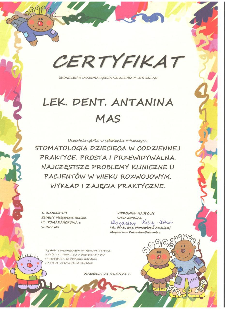 Jaki jest zakres porad oferowanych przez Antanina Mas?Antanina Mas to stomatolog. Na podstawie swojego doświadczenia i wykształcenia Antanina Mas oferuje usługi takie jak: Konsultacja stomatologiczna, leczenie próchnicy, ekstrakcja zęba, leczenie kanałowe, ekstrakcja zęba mlecznego, wizyta adaptacyjna (bez leczenia), Leczenie próchnicy u dzieci, wizyta bólowa (zaopatrzenie pacjenta).