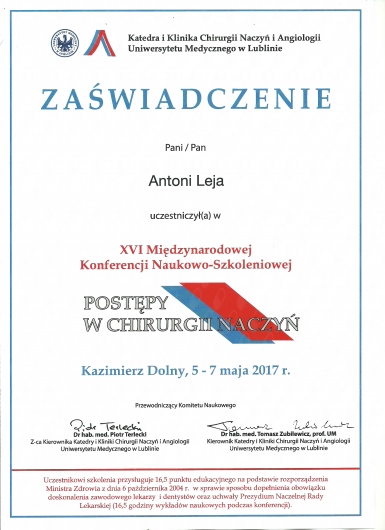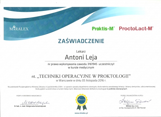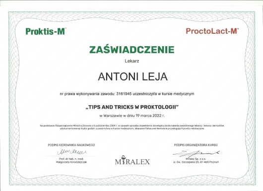 Pan doktor Antoni Leja to specjalista, który z pełnym zaangażowaniem oddaje się swojemu zawodowi. Widać, że praca jest dla niego nie tylko obowiązkiem, ale również pasją, dzięki czemu pacjent od razu czuje się w dobrych rękach. Po wizycie otrzymałem skierowanie do szpitala i to właśnie doktor Leja sam przeprowadził mój zabieg. To lekarz, któremu naprawdę można zaufać i którego z czystym sumieniem mogę polecić każdemu, kto szuka rzetelnej i życzliwej opieki medycznej.