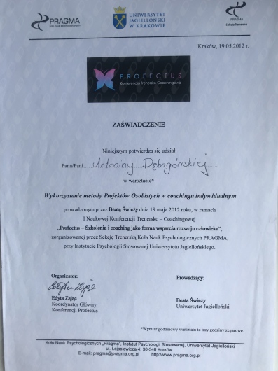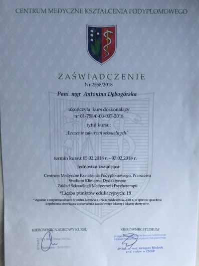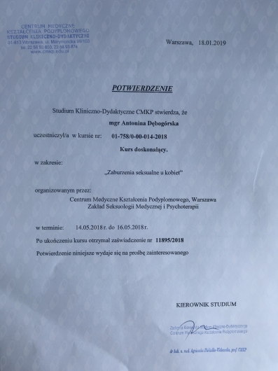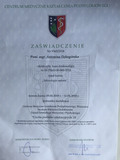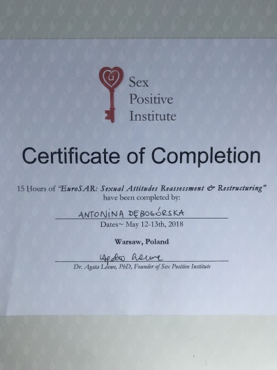 Ukończyłam cykl kursów doskonalących z seksuologii w Centrum Medycznym Kształcenia Podyplomowego oraz międzynarodowy program z zakresu sex coachingu (Sex Coach University, USA).