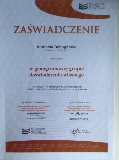 Ukończyłam Uniwersytet Jagielloński (psychologia ogólna) oraz całościowe szkolenie psychoterapeutyczne w Instytucie Poznawczym w nurcie CBT (w trakcie certyfikacji). Posiadam certyfikat Małopolskiego Centrum Psychoterapii z zakresu Psychoterapii Par.