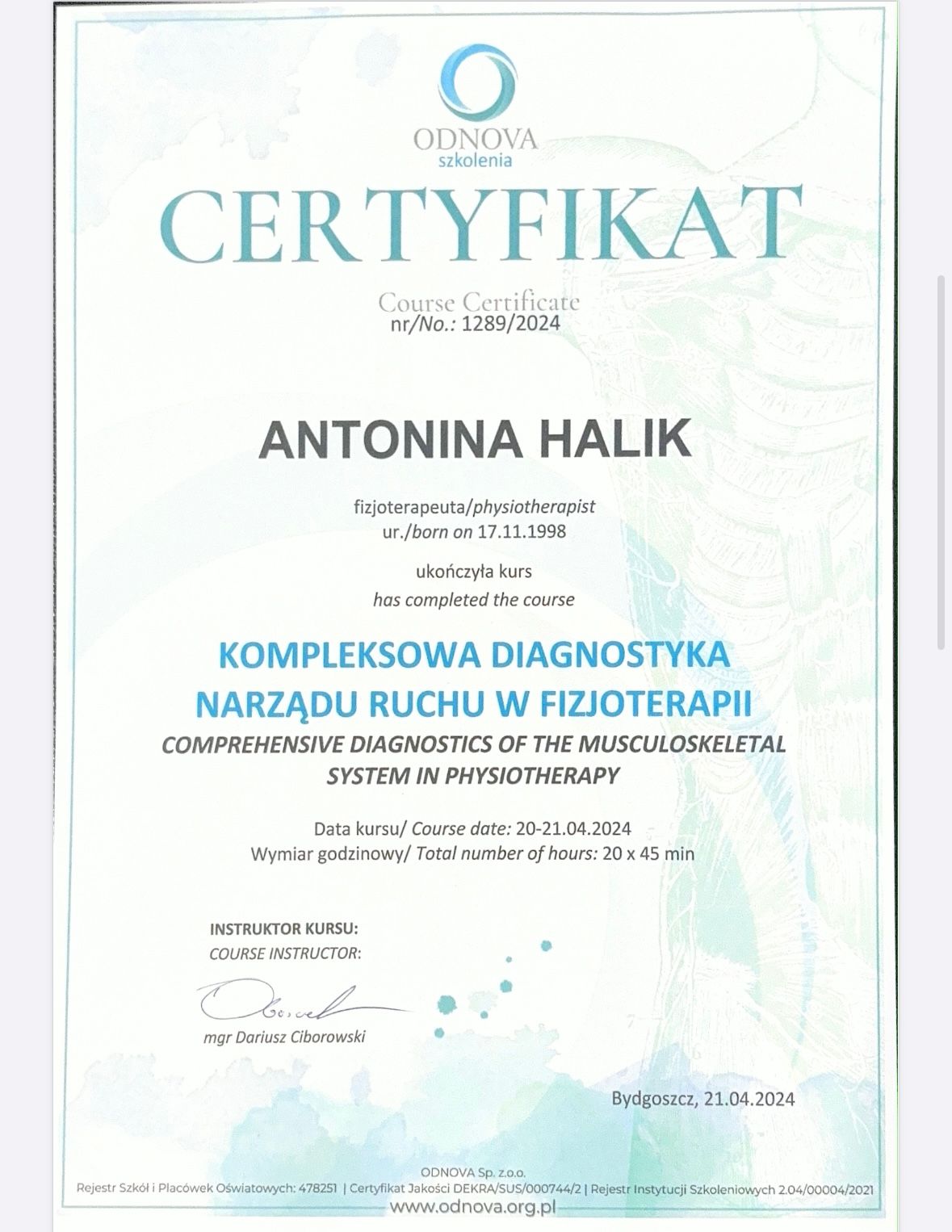 Kompleksowa diagnostyka narządu ruchu w fizjoterapii, ODNOVA SZKOLENIA