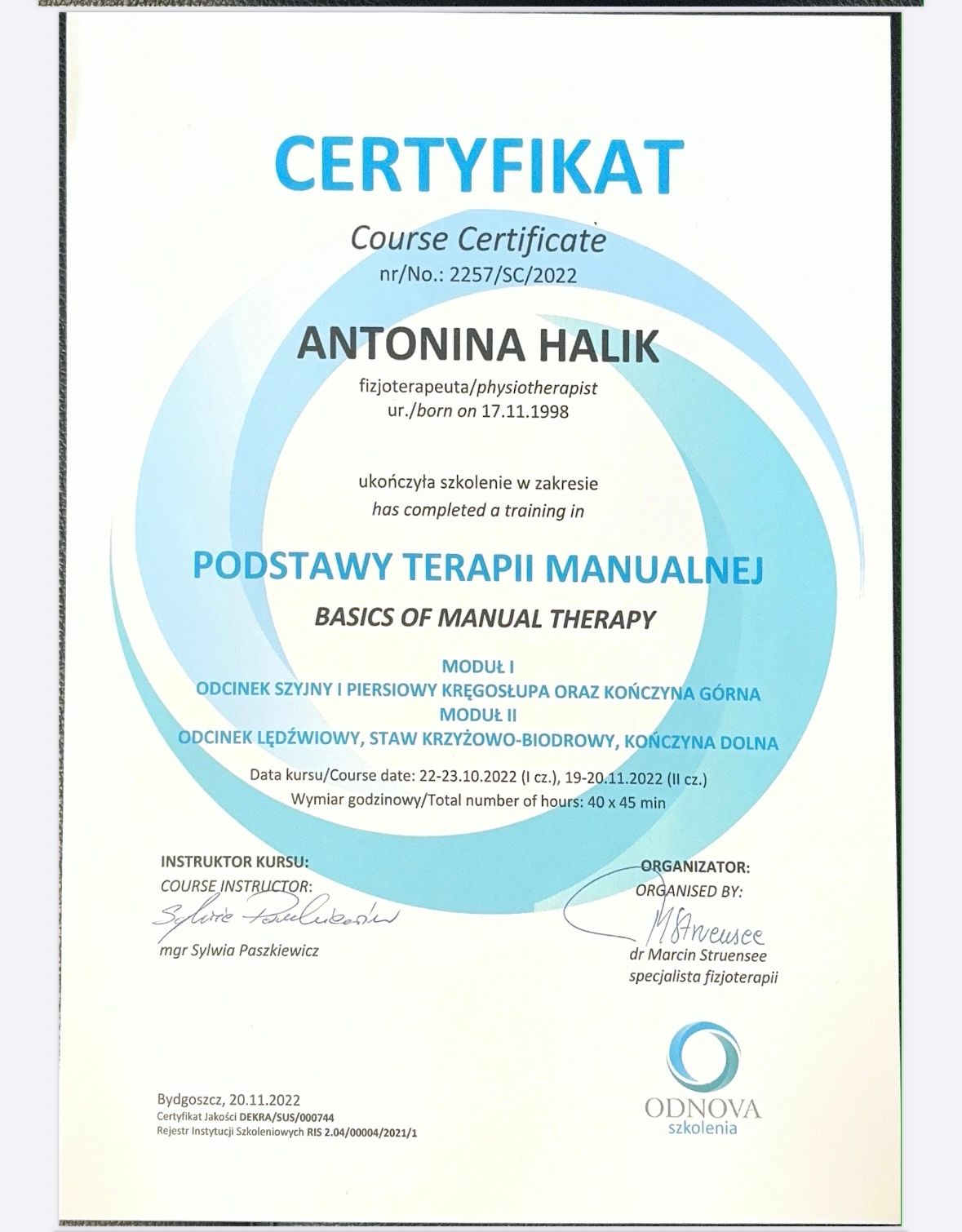 Podstawy terapii manualnej, 2 moduły, ODNOVA SZKOLENIA