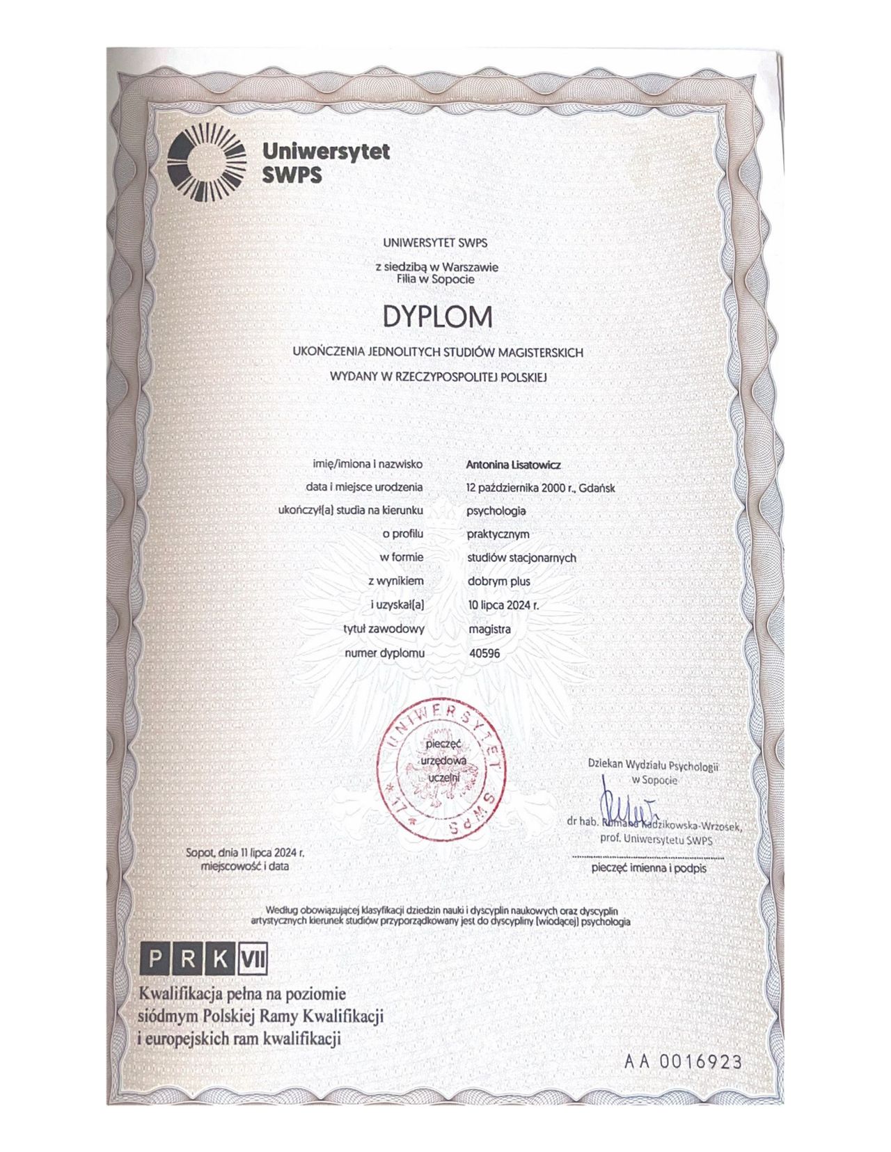 Jestem dyplomowanym psychologiem, absolwentką Uniwersytetu SWPS w Sopocie (specjalność kliniczna). Obecnie kontynuuję edukację w Krakowskim Centrum Psychodynamicznym, gdzie kształcę się w ramach profesjonalnej szkoły psychoterapii.