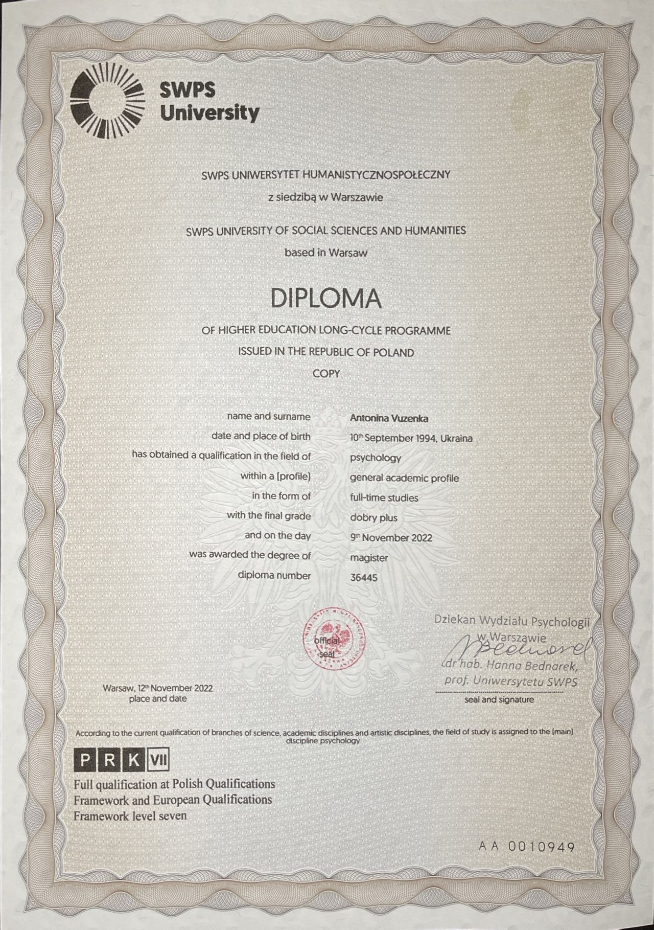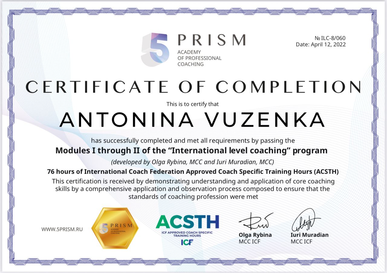 Jestem psycholożką i certyfikowaną coachką z podejściem rozwojowym. Ukończyłam pięcioletnie studia psychologiczne na Uniwersytecie SWPS, specjalność: psychologia kliniczna zdrowia oraz szereg szkoleń coachingowych opartych na standardach ICF – zarówno z coachingu ogólnego, jak i biznesowego.