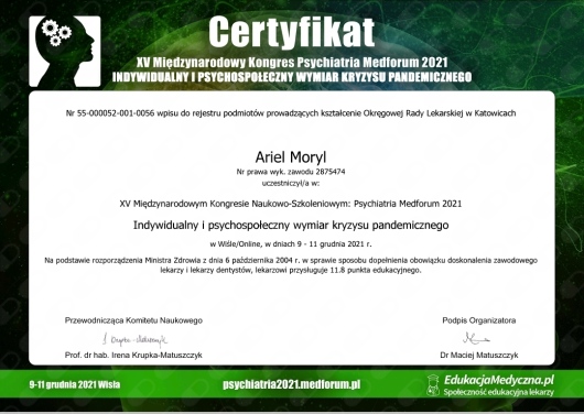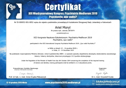 Bardzo profesjonalne podejście do pacjenta. Byłem już u kilku psychiatrów, gdzie wizyta zakończyła się po 10 min. wypisaniem leku antydepresyjnego. Pan Ariel wysłuchał do końca moich problemów i postanowił zmienić dawki leków jak i zaproponował nowe, które mają pomóc mi w wyjściu z moich lęków. Bardzo się cieszę, że w końcu trafiłem na specjalistę z powołania, który chce pomóc, a nie tylko wypisać receptę.