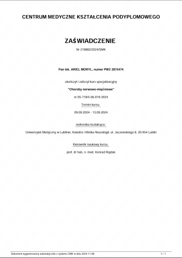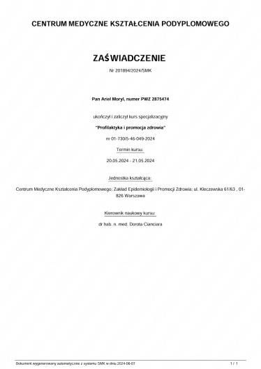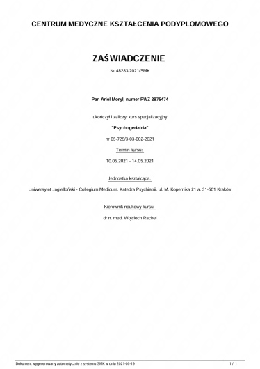 Jestem absolwentem Uniwersytetu Medycznego w Łodzi. Studia medyczne ukończyłem w 2016 roku. Szkolenie specjalizacyjne odbyłem w Klinicznym Oddziale Psychiatrycznym w 5 Wojskowym Szpitalu Klinicznym w Krakowie. Dodatkowo jako żołnierz zawodowy pełnię służbę czynną w 4 batalionie inżynieryjnym w Głogowie na stanowisku Szefa Służby Zdrowia.