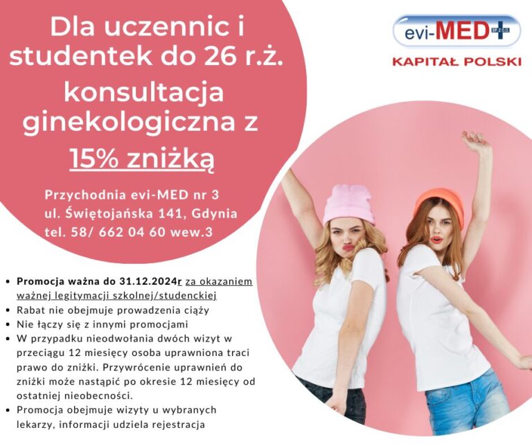 Dla uczennic i studentek do 26 r.ż konsultacje ginekologiczne z 15% zniżką, za okazaniem ważnej legitymacji szkolnej / studenckiej.