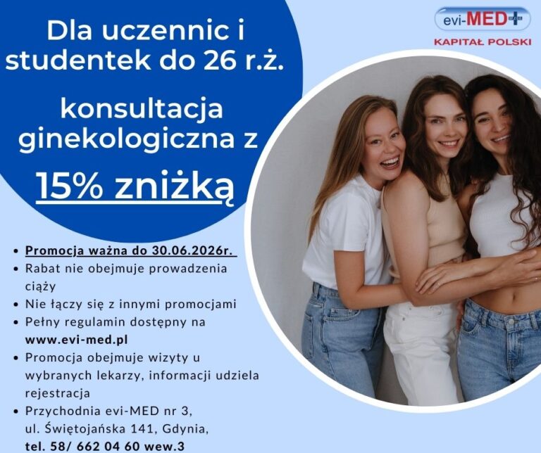 Dla uczennic i studentek do 26 r.ż konsultacje ginekologiczne z 15% zniżką, za okazaniem ważnej legitymacji szkolnej / studenckiej.