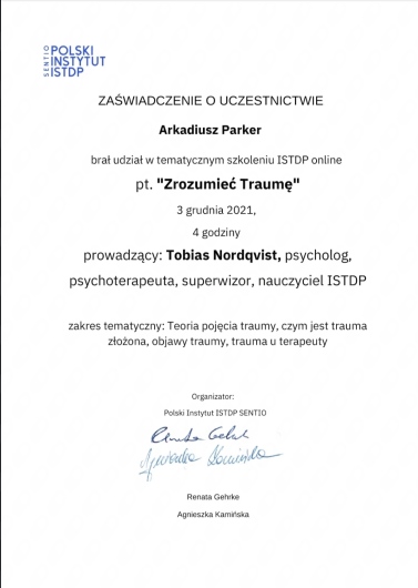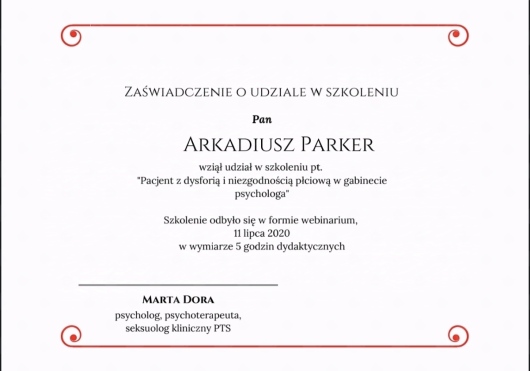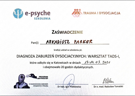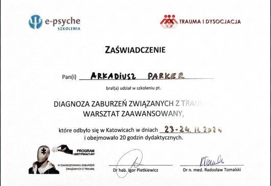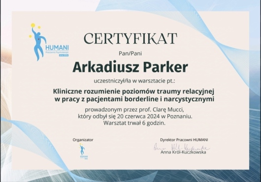 Jaki jest zakres porad oferowanych przez Arkadiusz Parker?Arkadiusz Parker to psycholog, psychoterapeuta. Na podstawie swojego doświadczenia i wykształcenia Arkadiusz Parker oferuje usługi takie jak: konsultacja psychoterapeutyczna, Diagnostyka i opinia dla osób transpłciowych, Konsultacja psychologiczna, psychoterapia indywidualna, konsultacja partnerska, badanie kwestionariuszem DIVA-5, badanie osobowości z opinią, badania przedoperacyjne, Diagnoza ADHD test diva 5.0, diagnostyka psychologiczna.