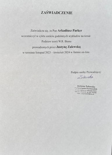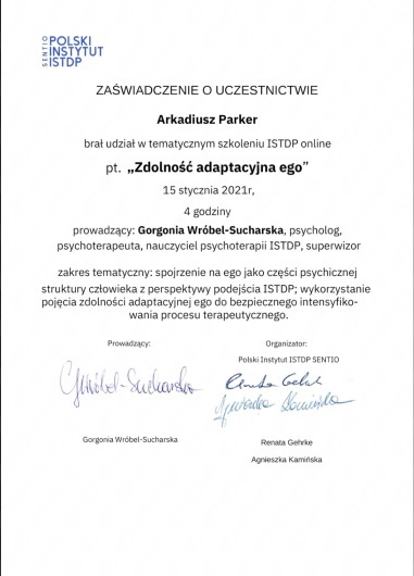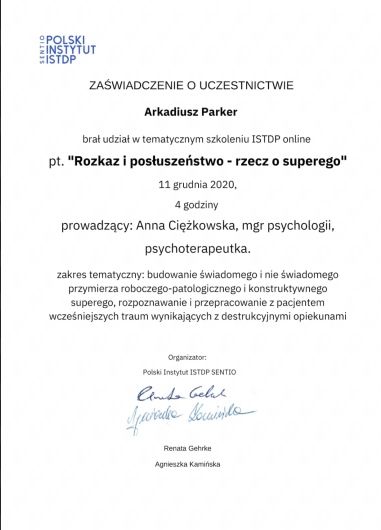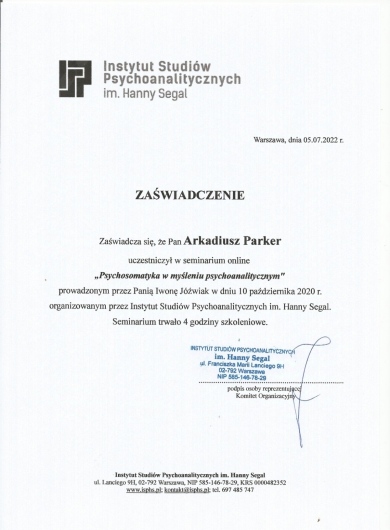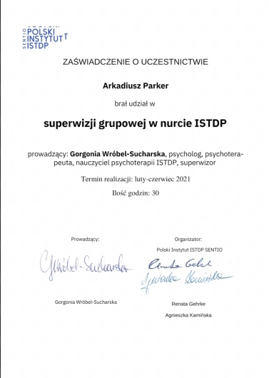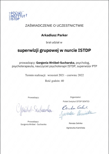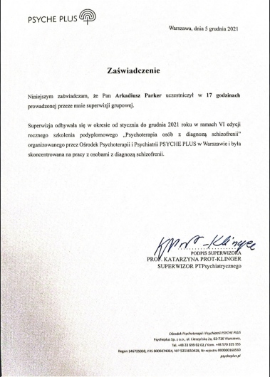 Swoją pracę regularnie poddaję superwizji. Stale podnoszę swoje umiejętności poprzez udział w kursach, warsztatach i szkoleniach, głównie z dziedzin psychologii, psychoterapii, neurologii oraz psychiatrii.